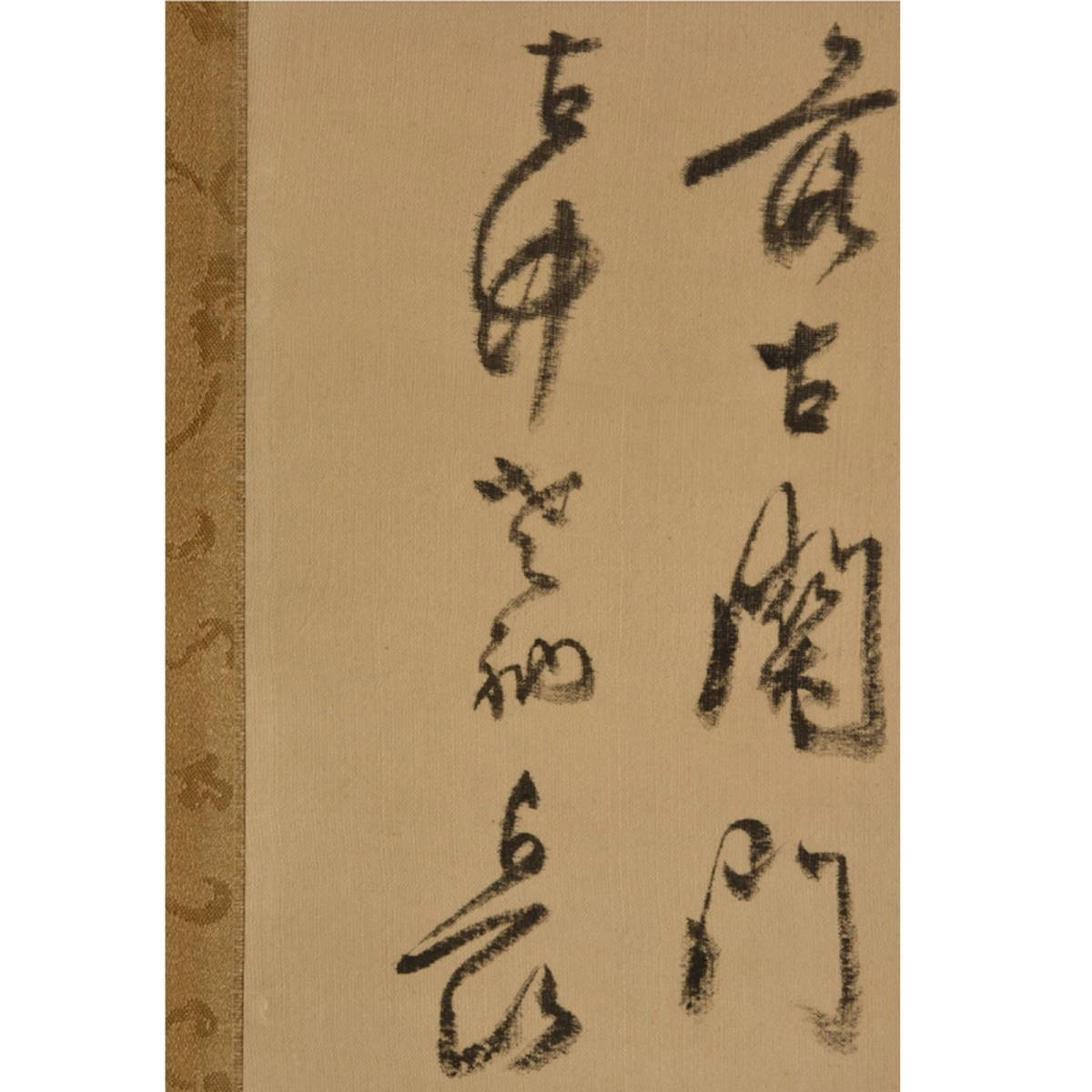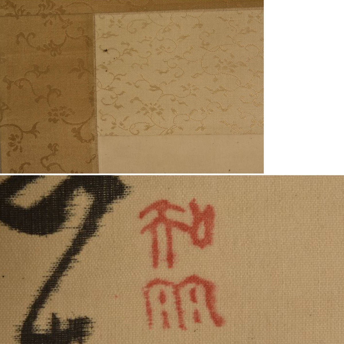 状態:絖本、肉筆、軸先骨(亀裂少々)。表装に傷み少々、時代によるくすみや、染みが見えています。