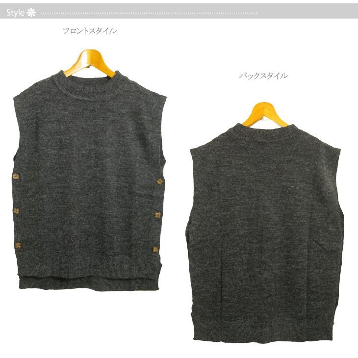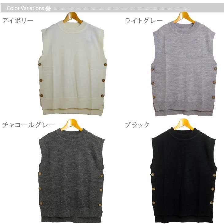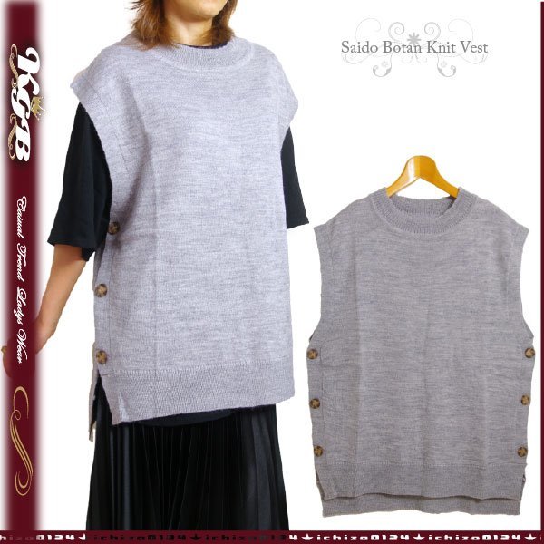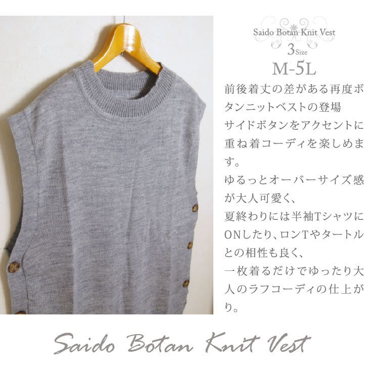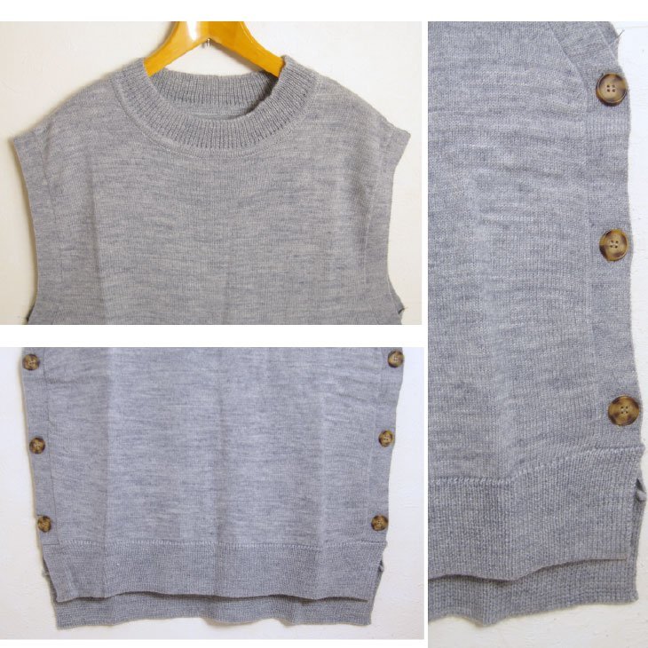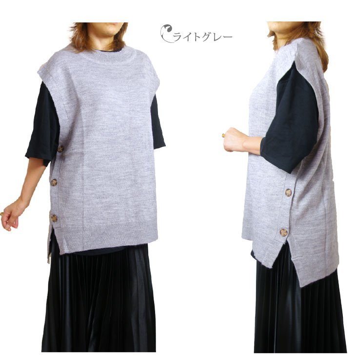 ■LL~3L ベスト ニット レディース 丸首 オーバーサイズ ラフ ナチュラル サイドボタン ライトグレー 新品■