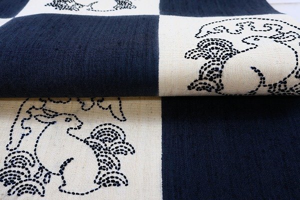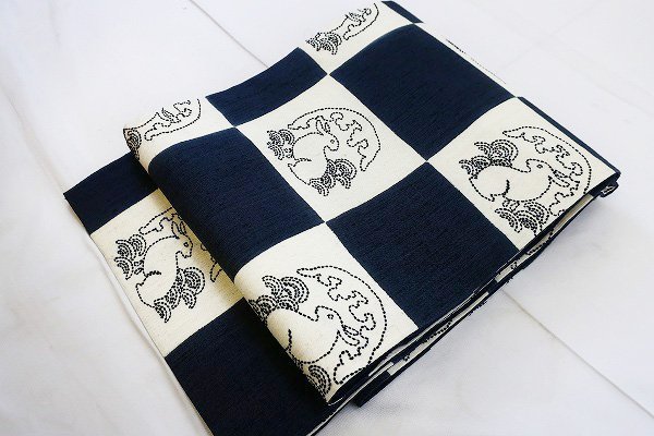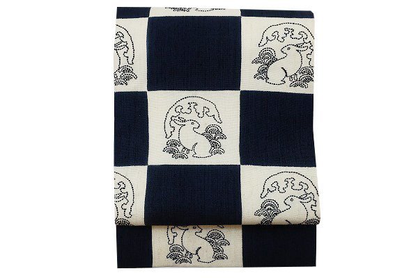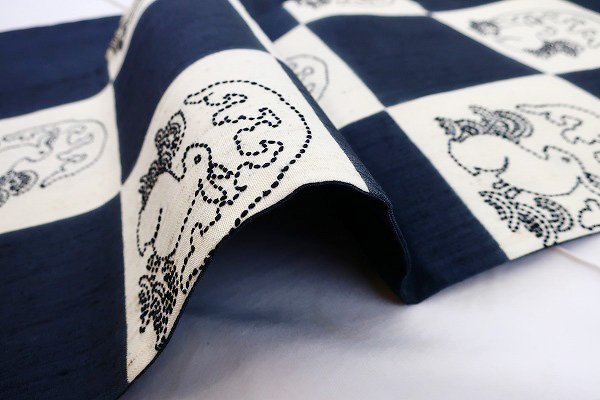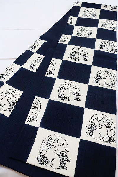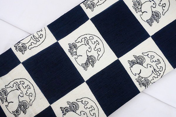 | 【送料無料】シャレ 袋帯 うさぎ 市松 刺し子 手刺し 紬地 紺 オフホワイト お洒落 古典 正絹 仕立て上がり m-5027 |