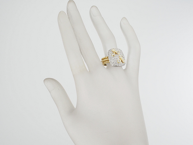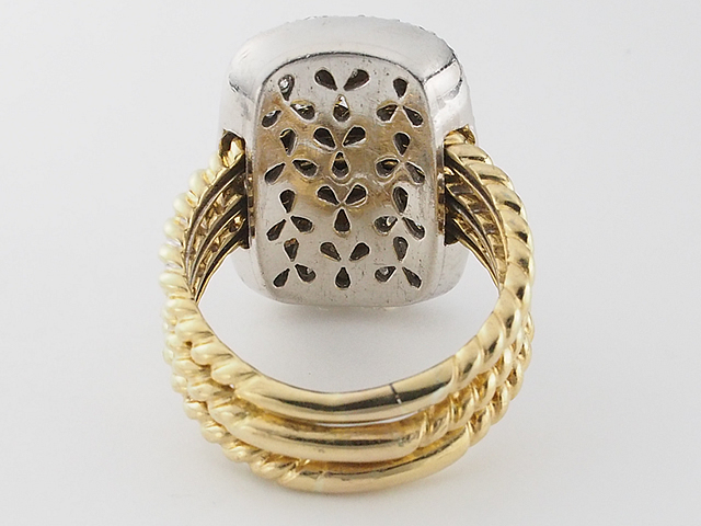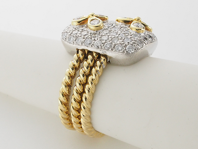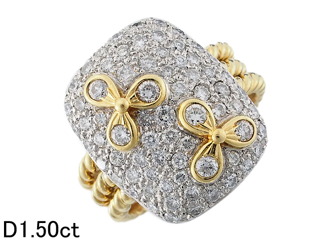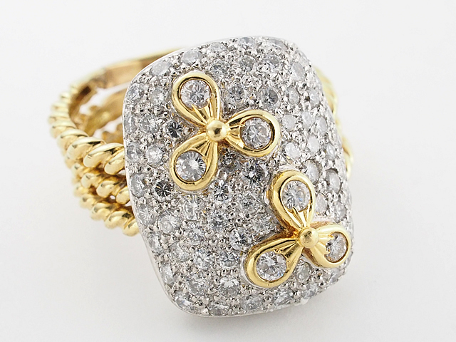 1.5カラットものパヴェ状のダイヤモンドを散りばめ、プラチナで飾りたてた、18金イエローゴールド製のデザインリングです。