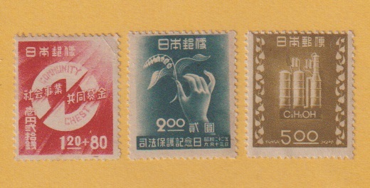 ○【記念切手】共同募金・司法保護・アルコール専売10年 (3種) 1947~48年 未使用
