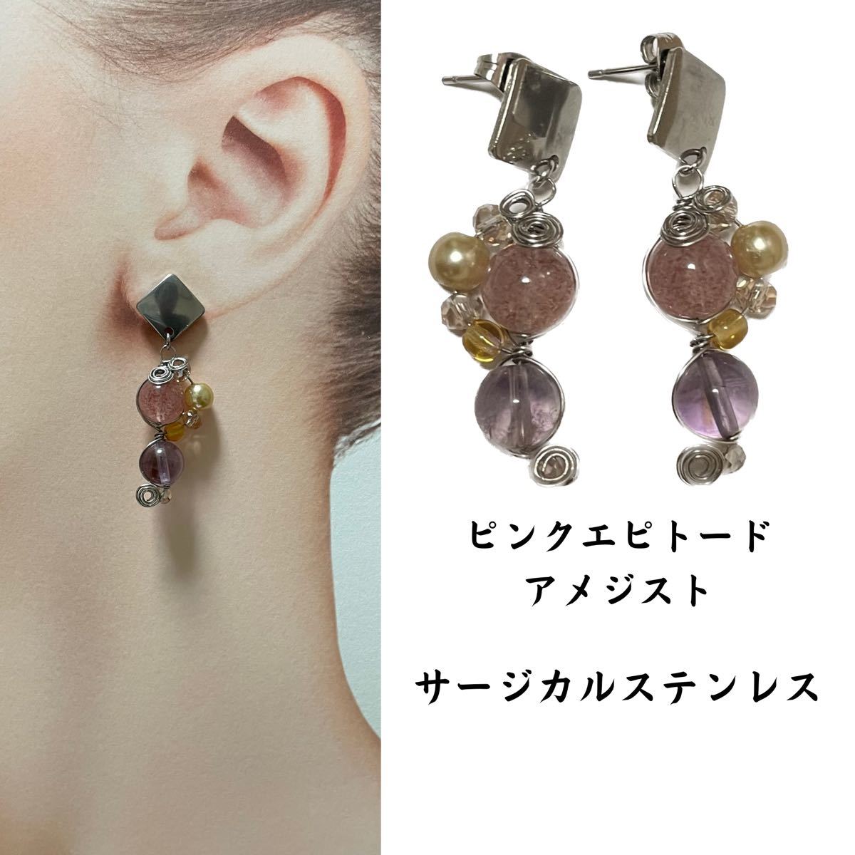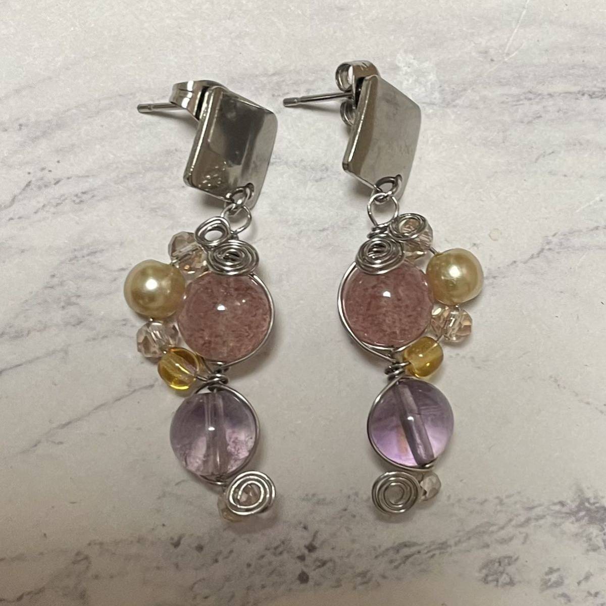 天然石とコットンパール、チェコビーズを使用して製作した、オリジナルデザインのピアスです。