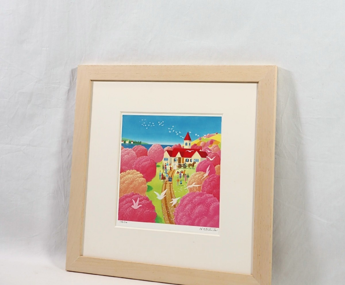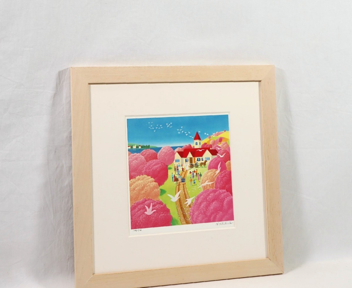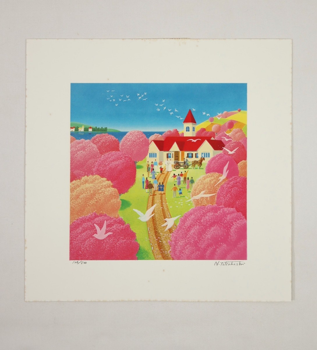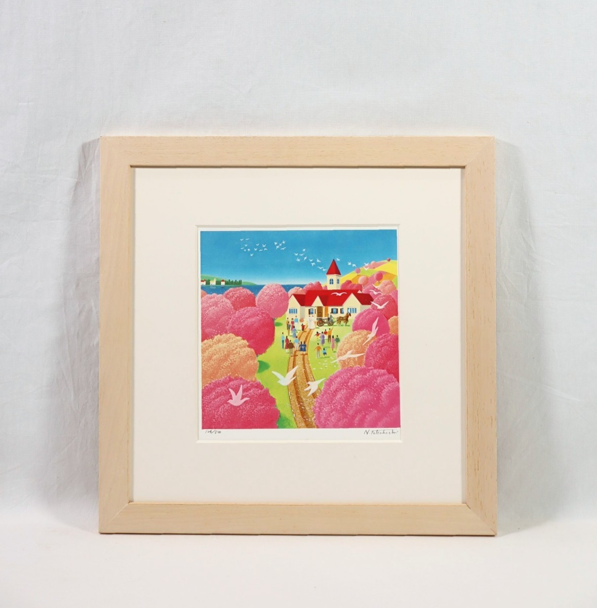 真作 高橋宣孝 シルクスクリーン「風景イラスト 桜に囲まれ赤い屋根の教会での結婚式」画寸 20cm×20cm 京都府出身 イラストレーター 7845