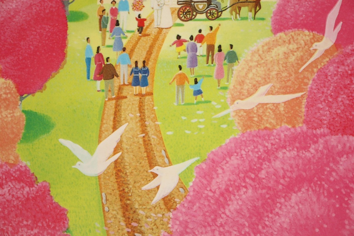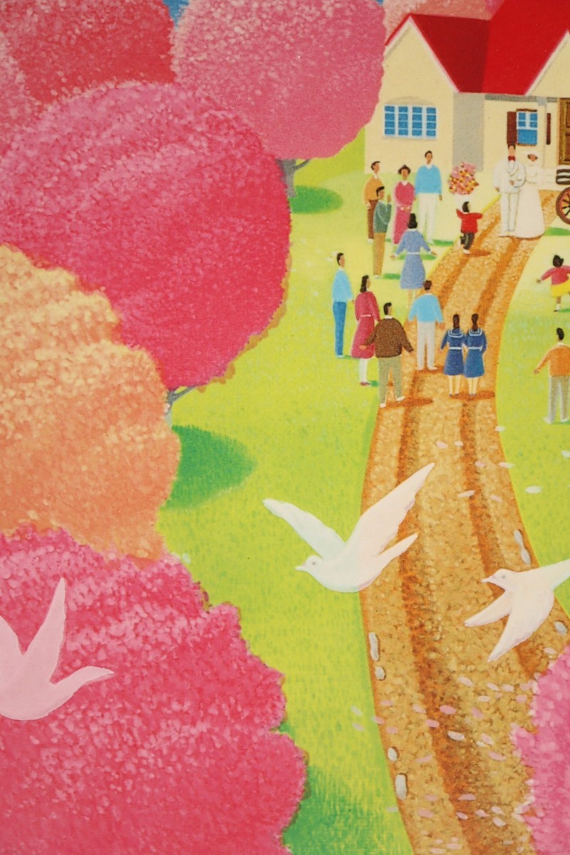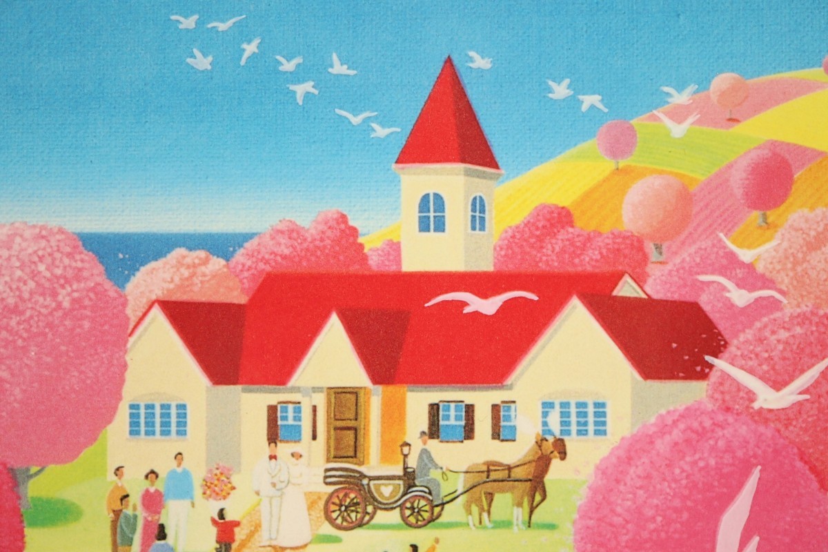 ★高橋宣孝 シルクスクリーン「風景イラスト 桜に囲まれ赤い屋根の教会での結婚式」★