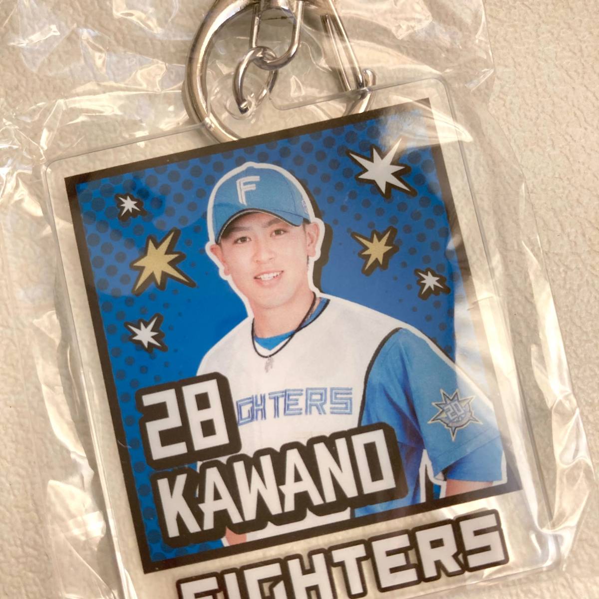 日本ハムファイターズ 28 河野竜生 選手 の アメコミ風 キーホルダー です。