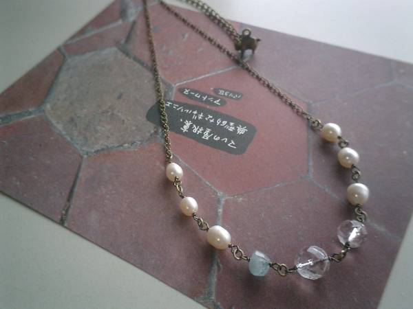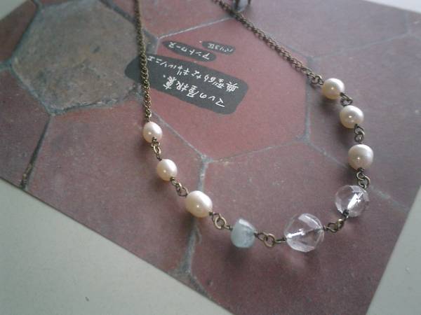 ロマンチック・パターンシリーズです♪巴里の宝石箱・・繊細な石を集めたネックレスです♪淡水パールや水晶やアクアマリンなど爽やかな色を合わせてロマンチックな表情です♪淡水パールは8ミリ位のバロック、水晶は10ミリ、12ミリのランダムカット、アクアマリンは10×7ミリ位のラフカットです♪長さは70センチ+アジャスター12センチで最長82センチ位です♪お揃いのブレスレットや同じシリーズも出品しています♪♪シンプルでいつまでも着けられるデザインを考えて作りました!ハンドメイドをご理解頂いてノークレーム、ノーリターンでお願いします