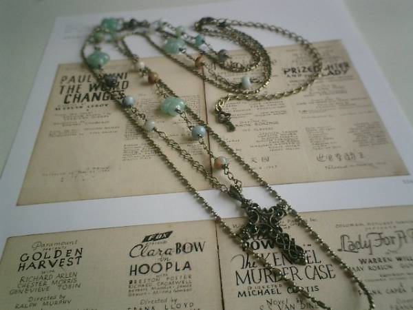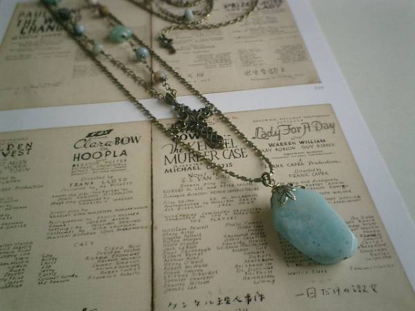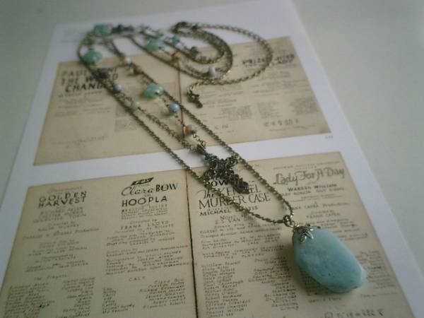 物憂げな春色・・シリーズです♪ニューヨーク・スケッチ・・キュートなアマゾナイトの2連のネックレスです♪4×6ミリのアマゾナイトにはアベンチュリンのフラワーやシックなクロスを合わせました♪繊細なボールチェーンのトップは20×30ミリ位のアマゾナイトです♪長さは72センチ+アジャスター14センチで最長86センチ位です♪お揃いのブレスレットも出品しています♪シンプルで飽きのこないいつまでも着けられるデザインを考えて作りました!ハンドメイドをご理解頂いてノークレーム、ノーリターンでお願いします