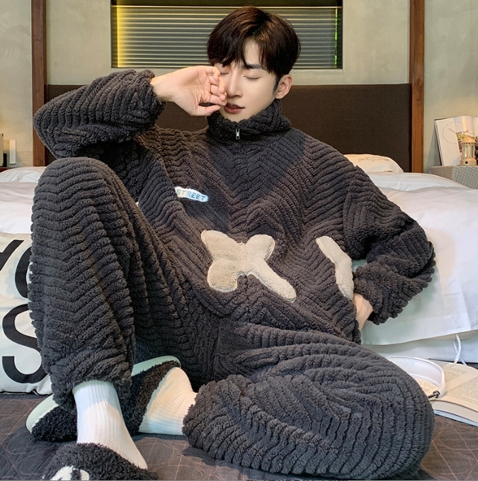 メンズ パジャマ ルームウエア モコモコ 男の子 寝間着  前開き 上下セット 襟たち 防寒 冬物 厚手 学生 部屋着 X698