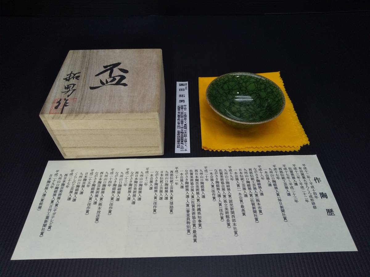 | 商品説明 | 品名:翠青瓷盃 作家:圓田拓男 寸法:径8.9㎝ 高さ3.4㎝ 状態:新品 美術年鑑評価額44万円(評価基準 陶磁器(花瓶)21.2㎝×21.2㎝) 三代 唐山窯 圓田拓男 ●西日本陶芸美術展 沖縄県知事賞 サガテレビ賞 ●西部伝統工芸展 熊本市賞 奨励賞 ●一水会展 一水会賞(最高賞) 佳作賞 ●九州山口陶磁展 毎日新聞社賞 佐賀新聞社賞 読売新聞西部本社賞 日刊工業新聞社賞 ●有田国際陶磁展 朝日新聞社賞 有田焼卸団地組合賞 ●佐賀美術協会展 佐賀美術協会賞(最高賞) 県立美術館長賞 ●ながさき陶磁展 佳作賞 審査員特別賞 ●日本陶芸展 賞候補 ●日本伝統工芸展 現代茶陶展 笠間陶芸大賞展 佐賀県展等、多数入選 |