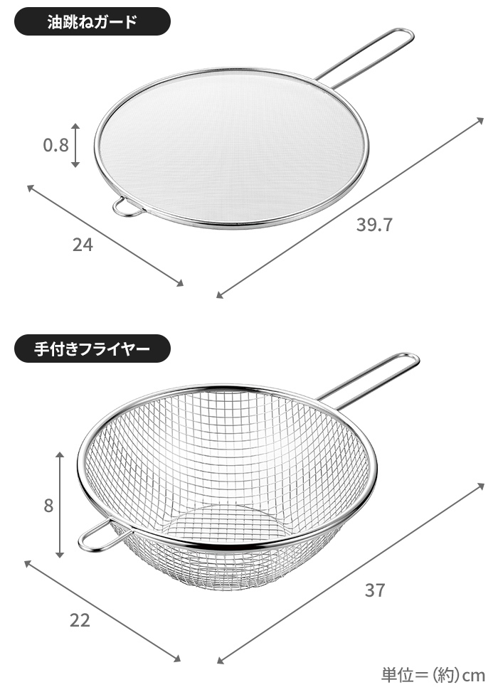 [天ぷら鍋]約幅22×奥行30×高さ12cm(本体高さ:9cm) [手付きフライヤー]約幅22×奥行37×高さ8cm [フライヤー油はねガード]約幅24×奥行39.7×高さ0.8cm |