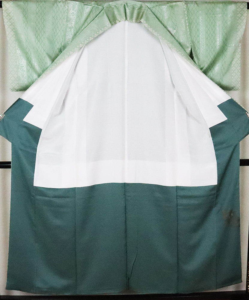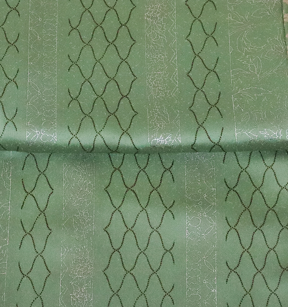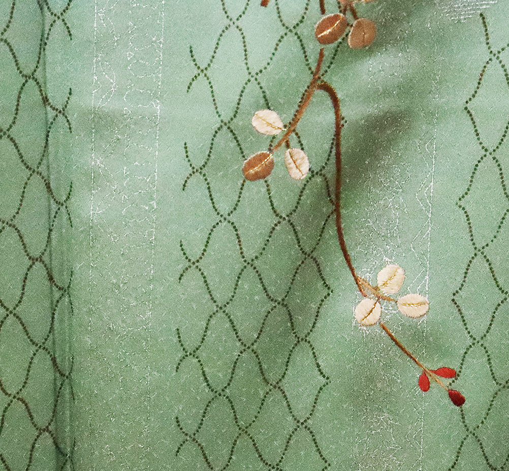 | 色・柄 | 訪問着 袷 丹後縮緬 綸子生地 薄緑地 花菱・網目・銀箔唐花縞地 刺繍椿 萩 扇 (写真では上手く色が出ない場合があります。ご了承下さい) |