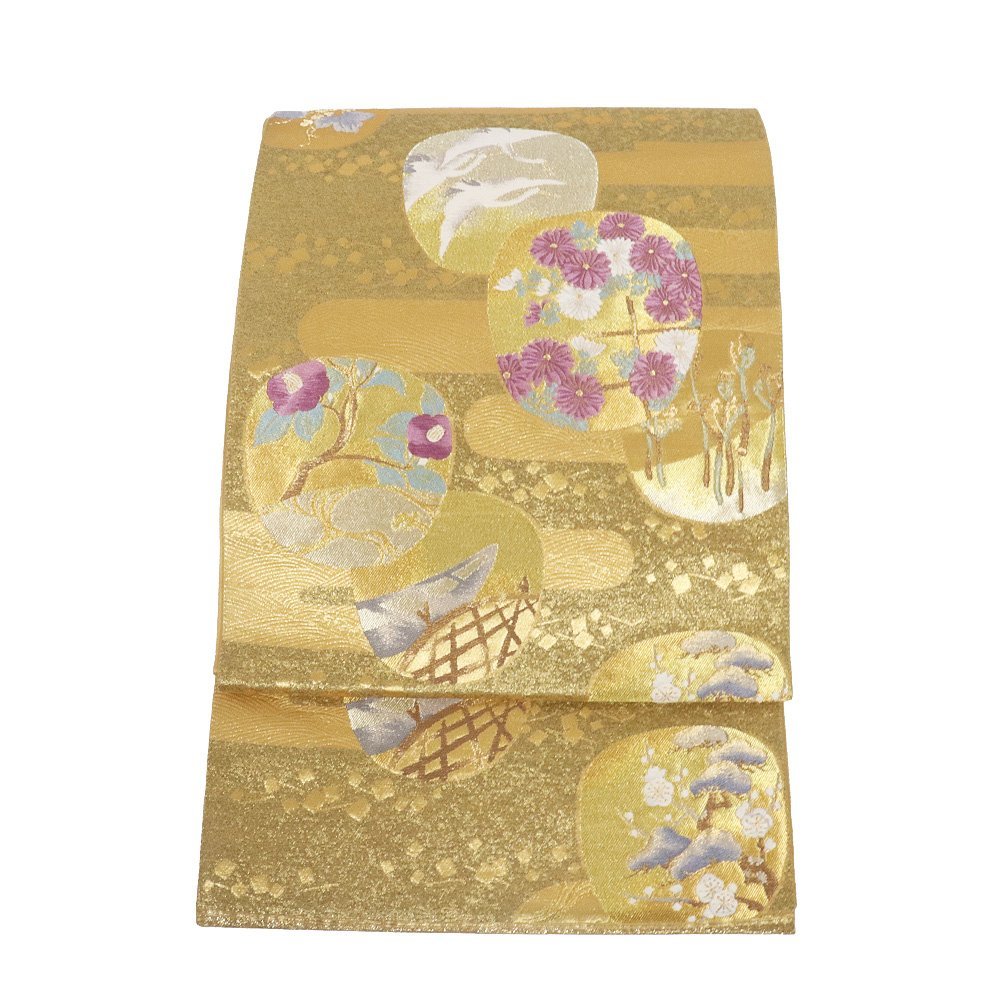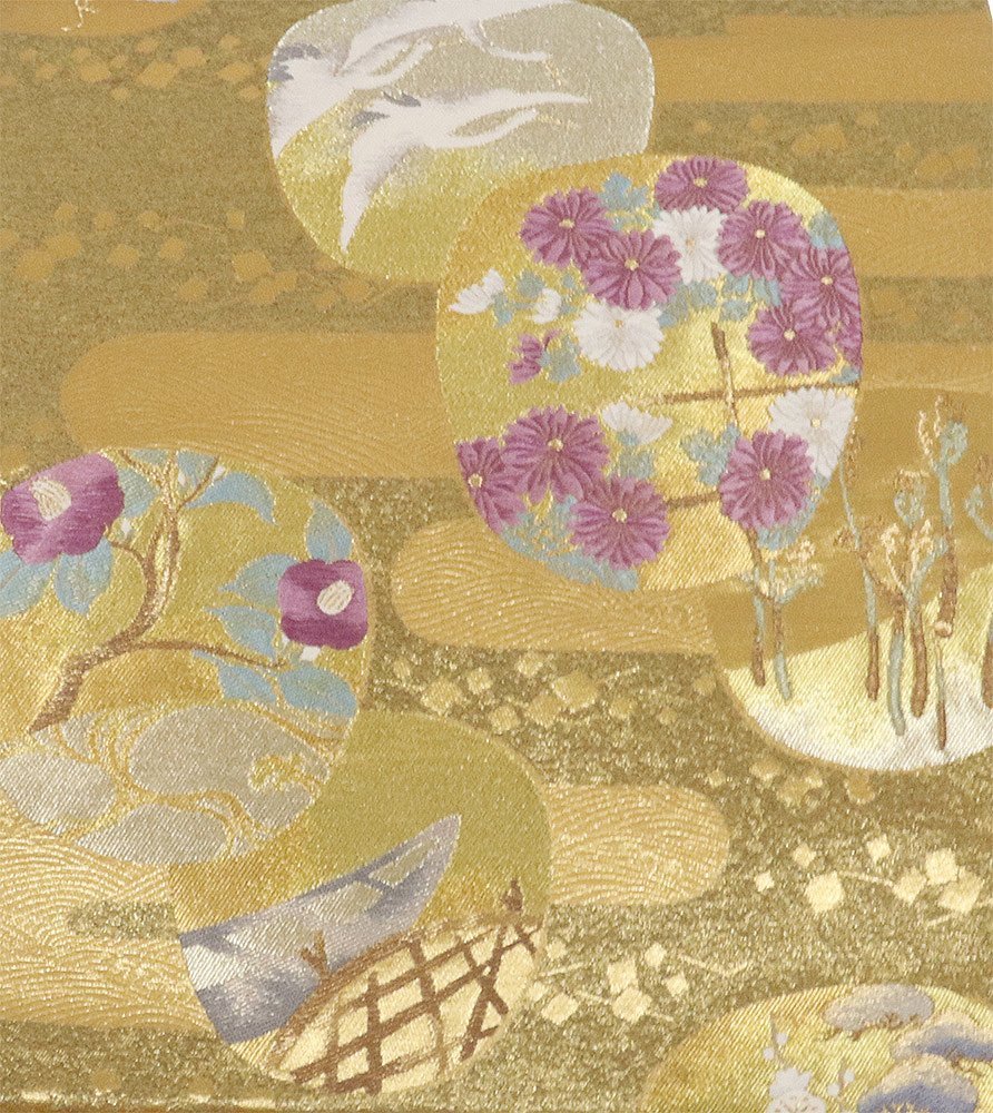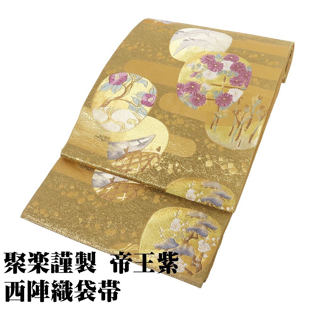 | 聚楽謹製 帝王紫 西陣織袋帯 金箔・紫・金茶・緑地 内輪文 鶴・舟・菊・椿・わらび・蔦 仕立て上がり |
