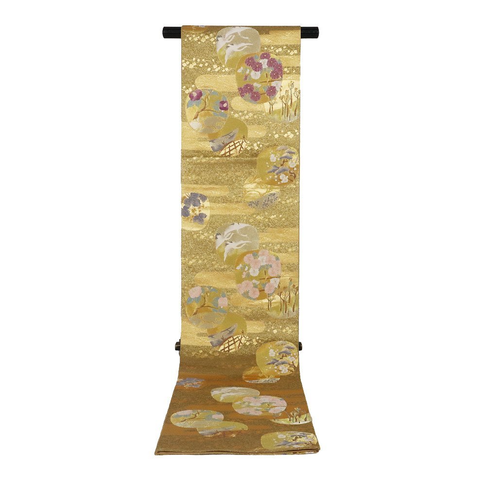 聚楽謹製 帝王紫 西陣織袋帯 金箔・紫・金茶・緑地 内輪文 鶴・舟・菊・椿・わらび・蔦 (写真では上手く色が出ない場合があります。ご了承下さい) ※お使いのディスプレイの種類や設定の差により 実物の色と画像の色が少々異なることもございます。 写真の枚数が多いので一度パソコンでご覧ください。 |