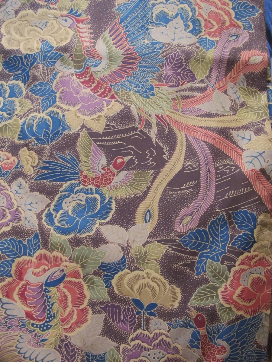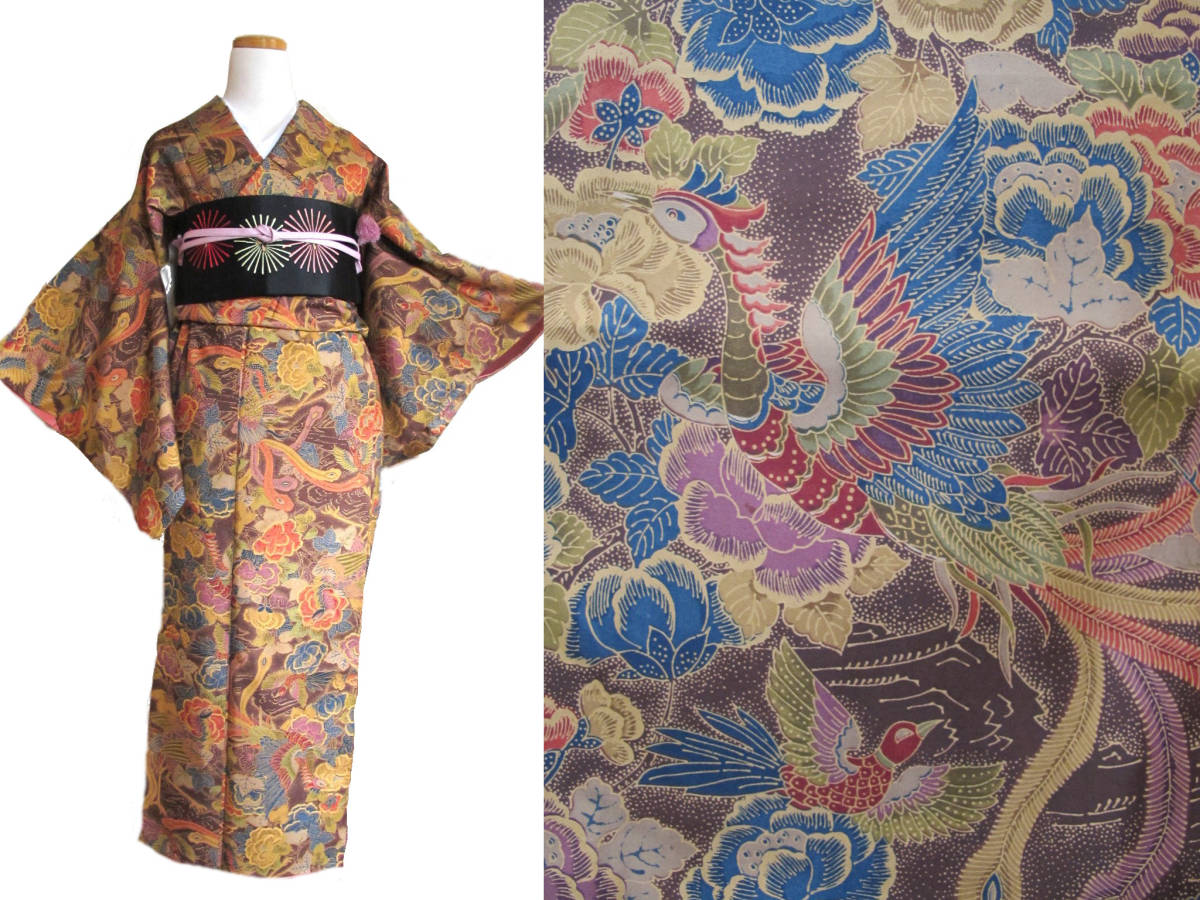 花鳥尽くしのお洒落な染め大島紬のセミアンティークのお着物です。 |