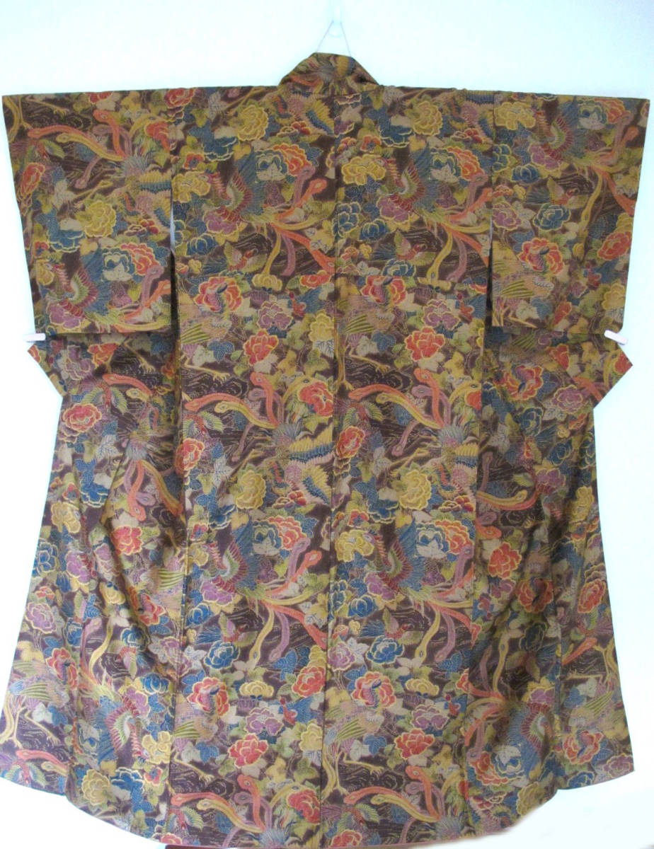 おおよその丈:身丈(肩)149cm、裄65cm、袖丈50cm、袖幅32cm、前幅22.5cm、後幅30.5cm 素材:正絹 お色:こげ茶