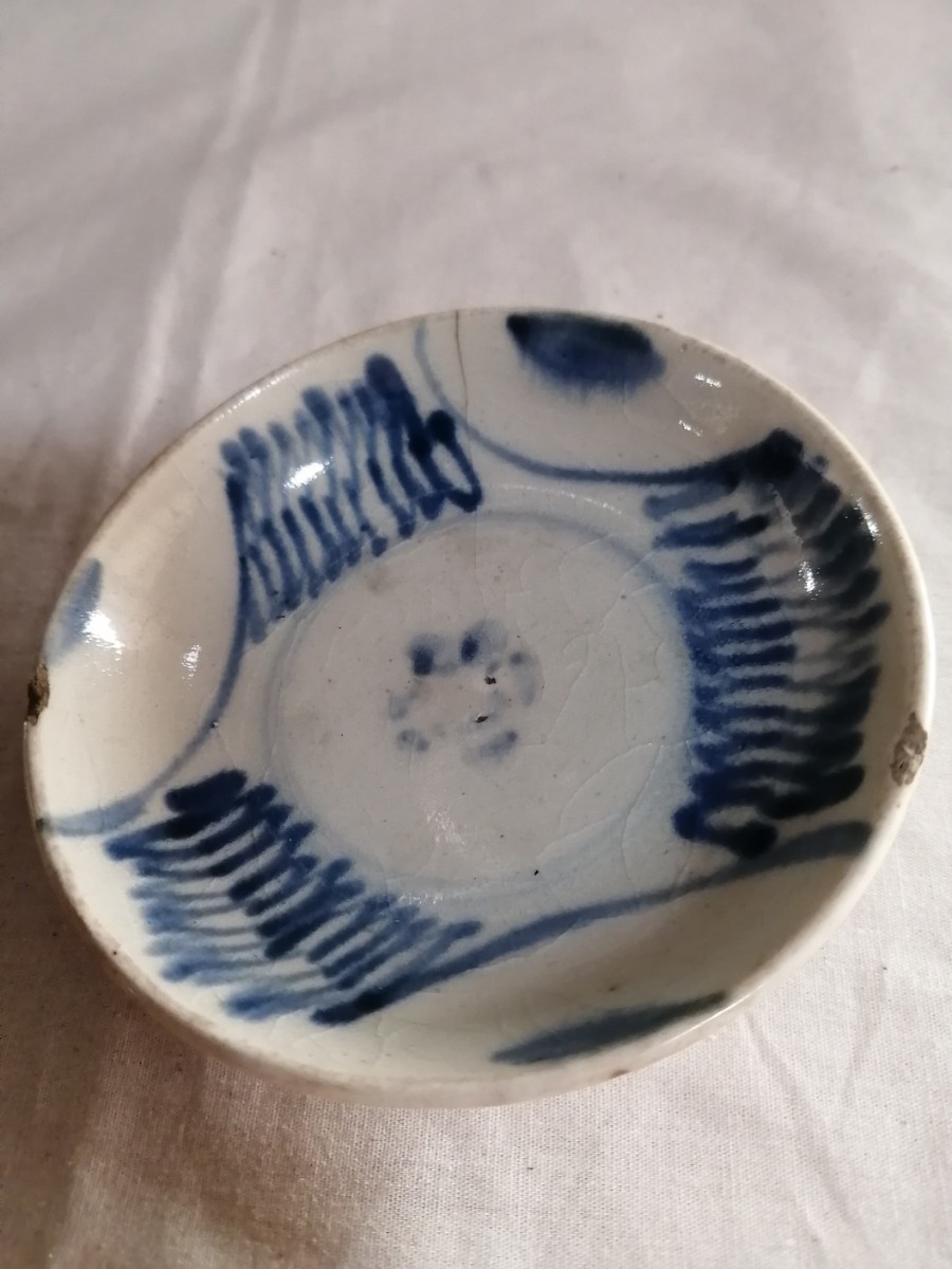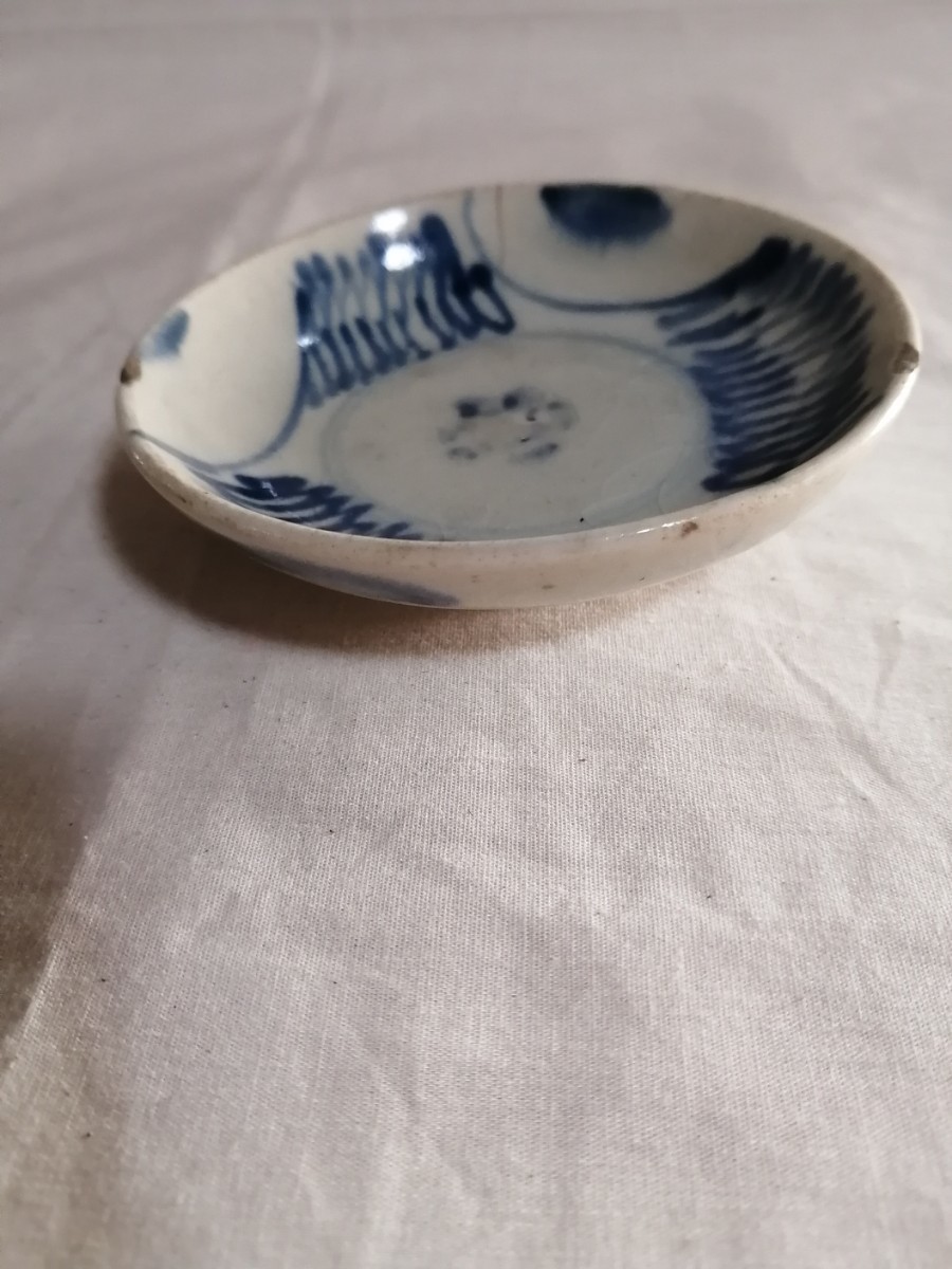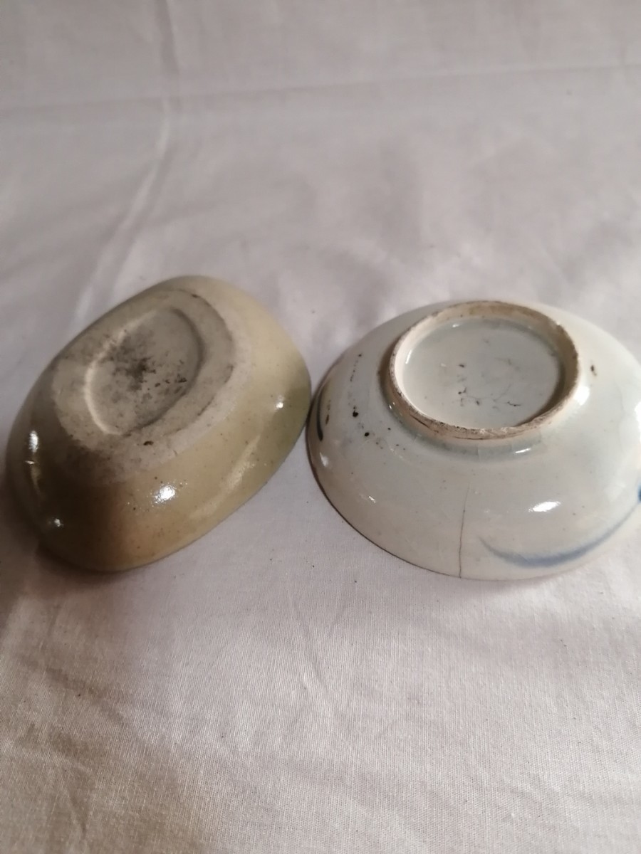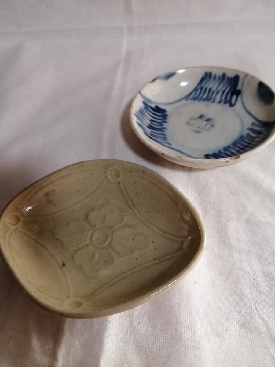 古瀬戸の小皿二枚です。染付の小皿は俗に美濃染付と呼ばれる素朴な焼き物です。瀬戸の製品で江戸中期です。ホツレとニューがあります。菱の型押しの小皿は江戸後期。上がりの良い製品です。