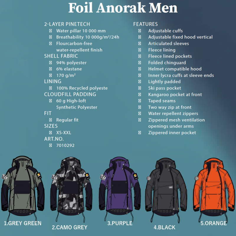 ・耐水圧:10,000mm ・透湿性:10,000g ・中綿:60g ・生地表面に撥水加工仕上げ ・シームテープ加工 ・ストレッチ素材 ・ベルクロストラップで調節可能な袖口 ・ドローコードで調節可能なフード ・立体裁断された肘 ・カンガルーポケット ・口元にベントホール ・止水ジップ仕様 ・Fit:Regular ・ウェストのパウダーガード:なし ・手首部分のカフ:あり ・脇の下のベンチレーション:あり ・パスケース:あり(袖) ・生地の厚さ:ふつう |