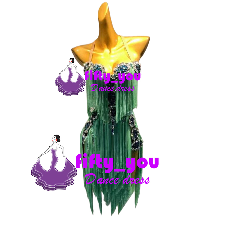 新品fifty_you レディース社交ダンスドレス ラテン競技試合用お洒落ショートドレス サイズオーダー ライトストーン飾り グリーン系