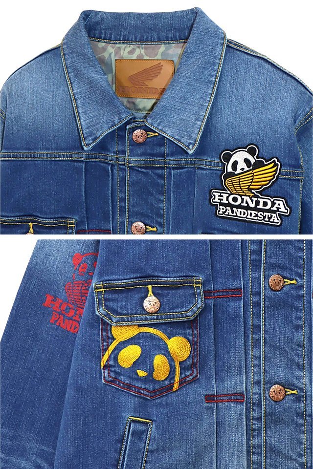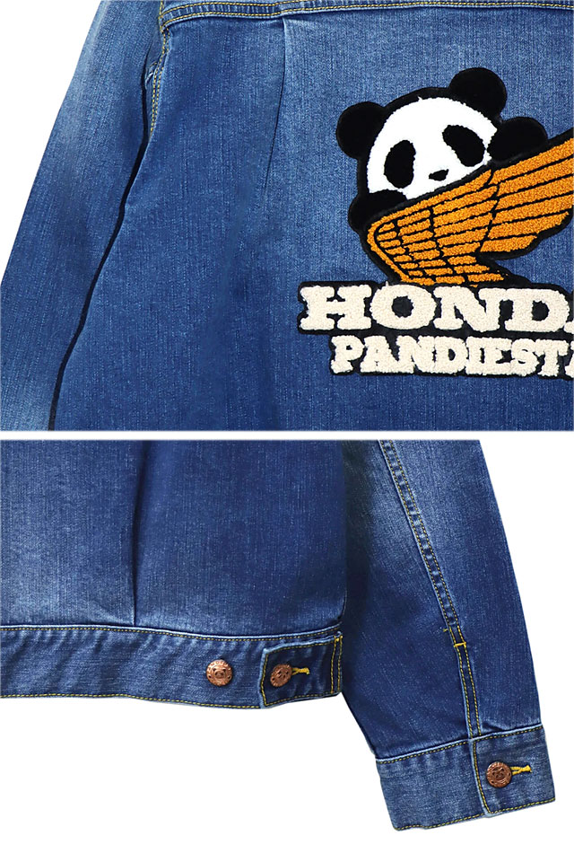 和柄ブランド【錦】の姉妹ブランドとして誕生した、お茶目なパンダをモチーフとした【PANDIESTA JAPAN】より「HONDA×PANDIESTA WINGロゴデニムジャケット(533511)」のご紹介です。 オートバイ販売台数、売上高世界首位を誇る【Honda】とのコラボレーション第3弾が今年の冬、登場いたします。 Hondaの象徴であるウイングマークを使い、スタイリングするシーンを選ばず、幅広い世代に取り入れていただきたく、着心地&穿き心地の良いストレッチデニムを用いたデニムシリーズを企画しました。 ウイングマークから顔を覗かせるパンディエスタをメインモチーフとして起用し、前後共に刺繍で施したデニムジャケットになります。 アメリカの黄金期に登場したデニムジャケットとして有名な『2nd/セカンド』というモデルをベースにデザインされており、ショート&ワイドのボックスシルエットや、胸まわりに立体的なゆとりを確保して動きやすくするフロントプリーツなどを再現しつつ現代的なシルエットで、背中のウイングマークには手触り感のあるサガラ刺繍を用いています。 レザーパッチにはHondaウィングの刻印を施し、ネオバーボタンなど付属品にはパンディエスタのオリジナルを使用しています。 ベーシックなワンウォッシュのインディゴカラーの他に、濃淡のコントラストが美しいユーズドカラー(ストーンウォッシュ)をラインナップ。 タウンユースではもちろん、伸縮性のあるストレッチデニムを使用しているので背中や袖回りの稼働領域も大きく、オートバイのライディングやサイクリングのウエアとしてもお使いいただけます。 | |||||||||||||||||||||||||