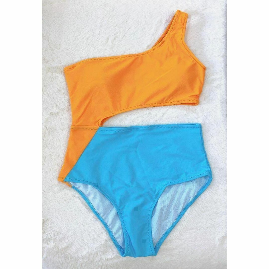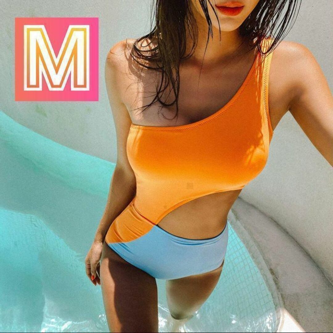 オレンジと水色のバイカラーがとっても斬新でスポーティー&健康的な印象を演出します!今年大流行のワンショルダーと左サイドカットのアシンメトリーデザインがとってもオシャレ インポートらしいセクシーさとトレンド感が詰まった1枚です。