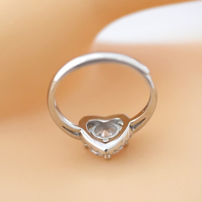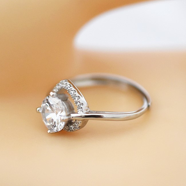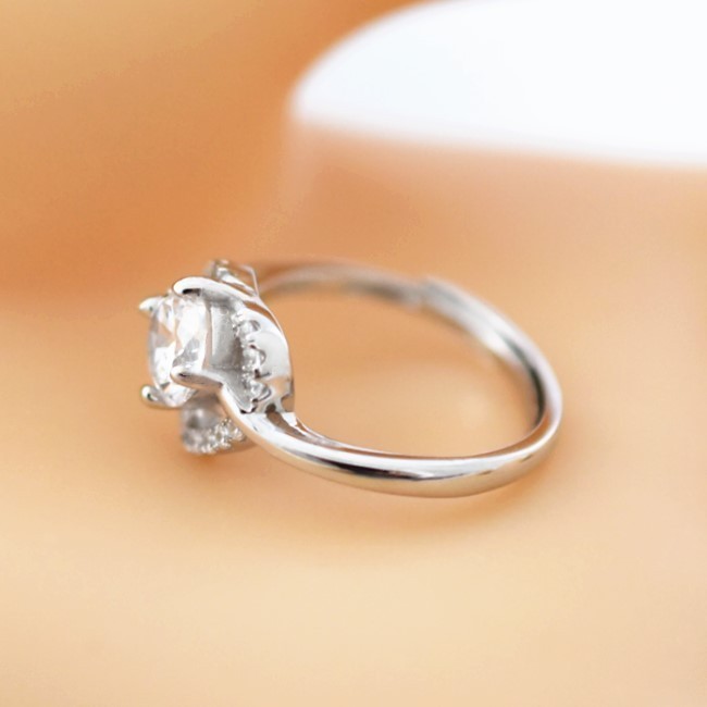 ●金属素材:シルバー925(刻印あり)、プラチナ仕上げ。●ストーン::キュービックジルコニア。中心石直径約 6mm、この他約1mm/個。●リング幅:約2mm 。●サイズ:11号~16号、調整可能。●重さ:3g。