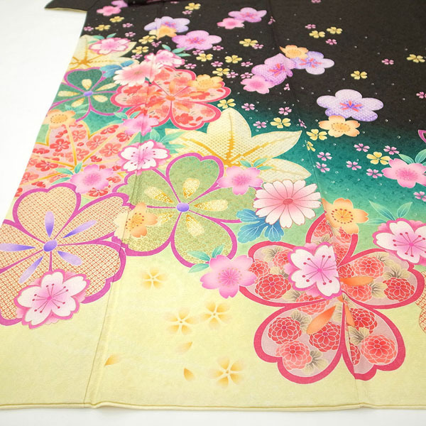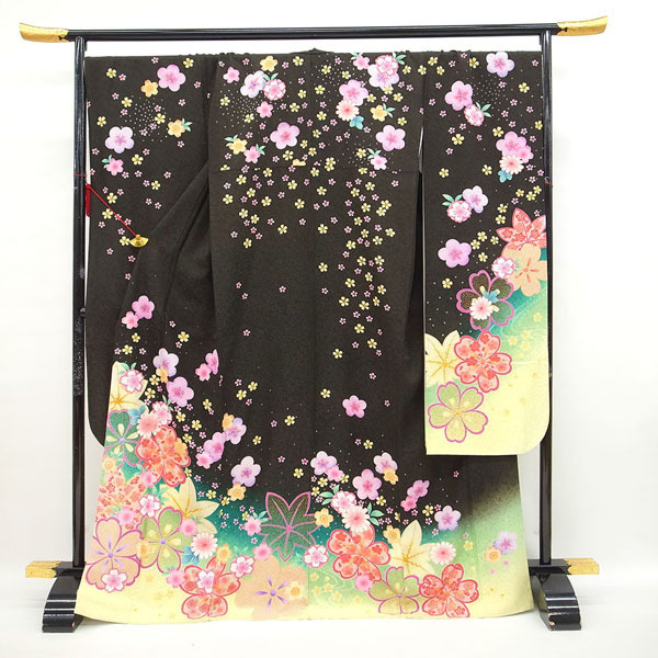 【中古】 振袖 袷 着物 銀通し 正絹 絹 金駒刺繍 ぼかし染 濃黒グレー ぼかし 桜 梅 鹿の子 成人式 二十歳 結婚式 結納 パーティーなど リサイクル 購入 販売 中古 仕立て上がり 身丈173 裄73.5 TLサイズ トールサイズ みやがわ sb10836