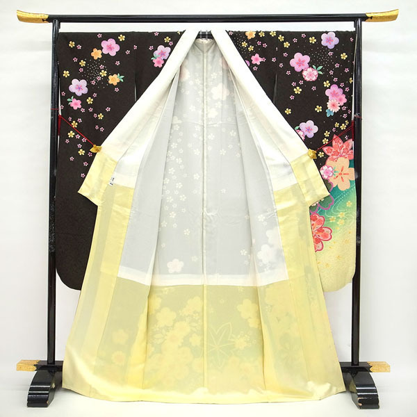振袖 袷 着物 銀通し 金駒刺繍 ぼかし染 濃黒グレー 桜 梅 鹿の子 成人式 中古 仕立て上がり 身丈173 裄73.5 TLサイズ みやがわ sb10836