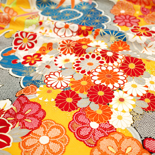 そこに、雲や菊・竹・梅・橘・花菖蒲・麻の葉など花古典柄が染められています。