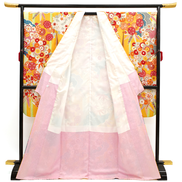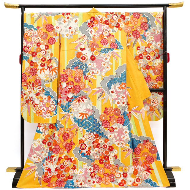 【中古】 振袖 袷 着物 正絹 絹 金銀彩加工 刺繍 サンフラワー色 黄色 雲 菊 地紋 本紋 フォーマル 成人式 二十歳 結婚式 結納 パーティーなど 販売 購入 リサイクル 中古 仕立て上がり 身丈172.5 裄71 TLサイズ みやがわ sb13604