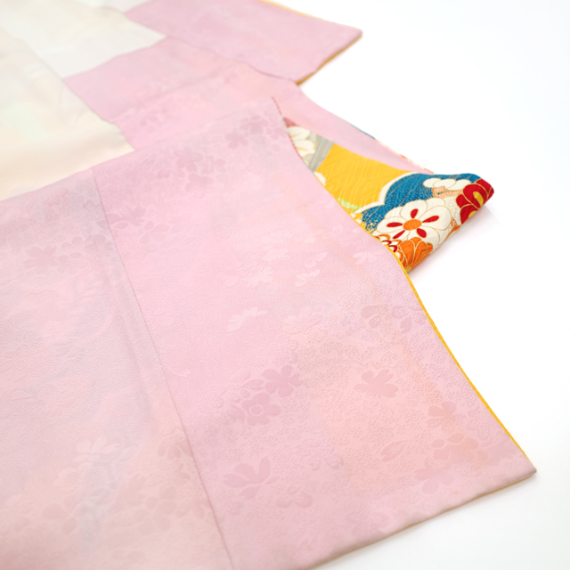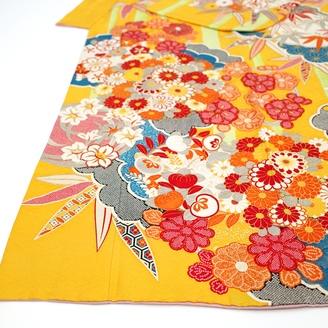 本紋の地紋が施されたこちらのお品は、美しいサンフラワー色(少い濃い黄色)地。