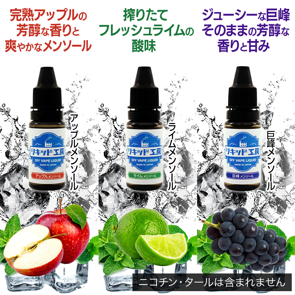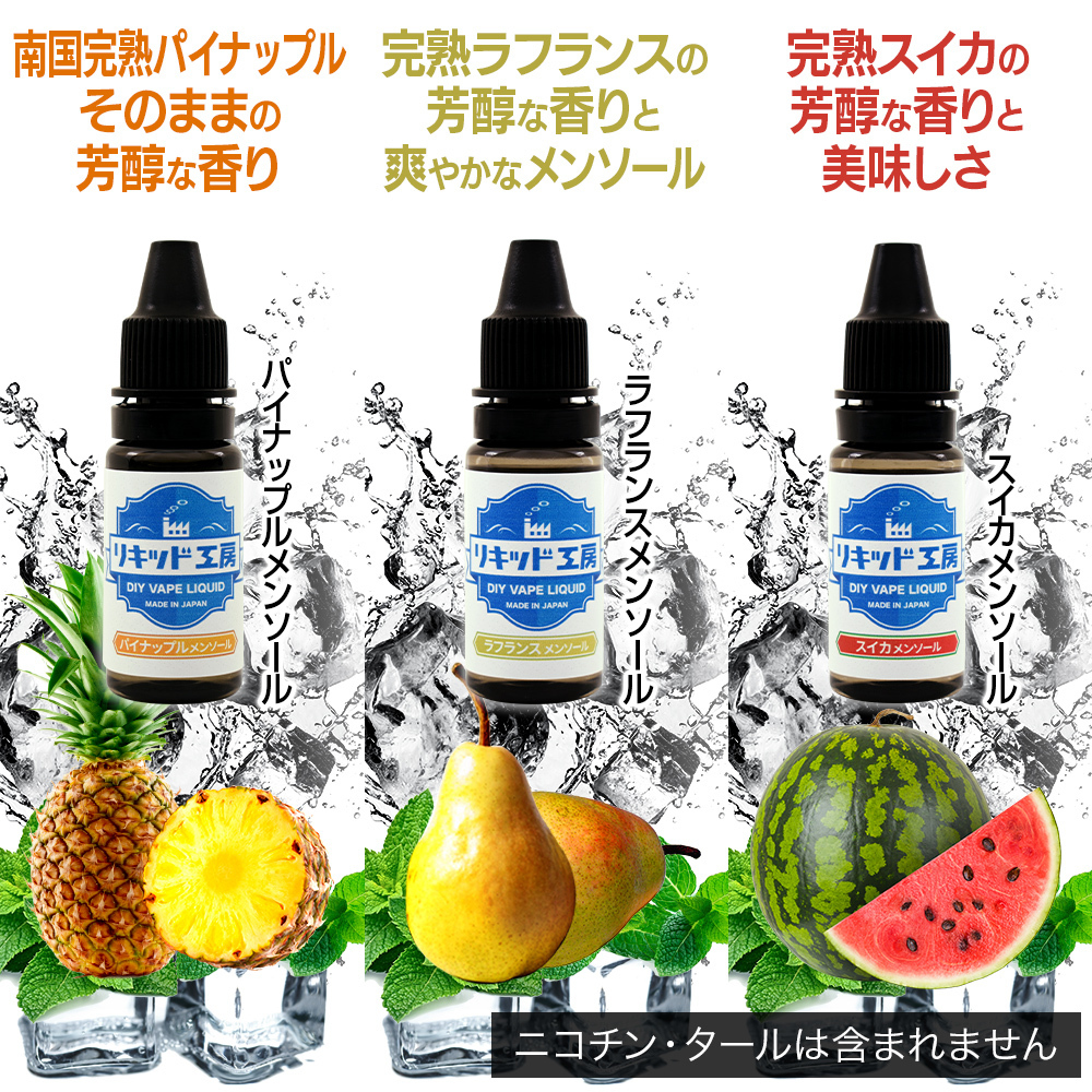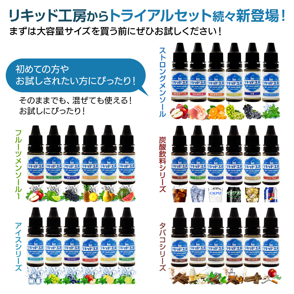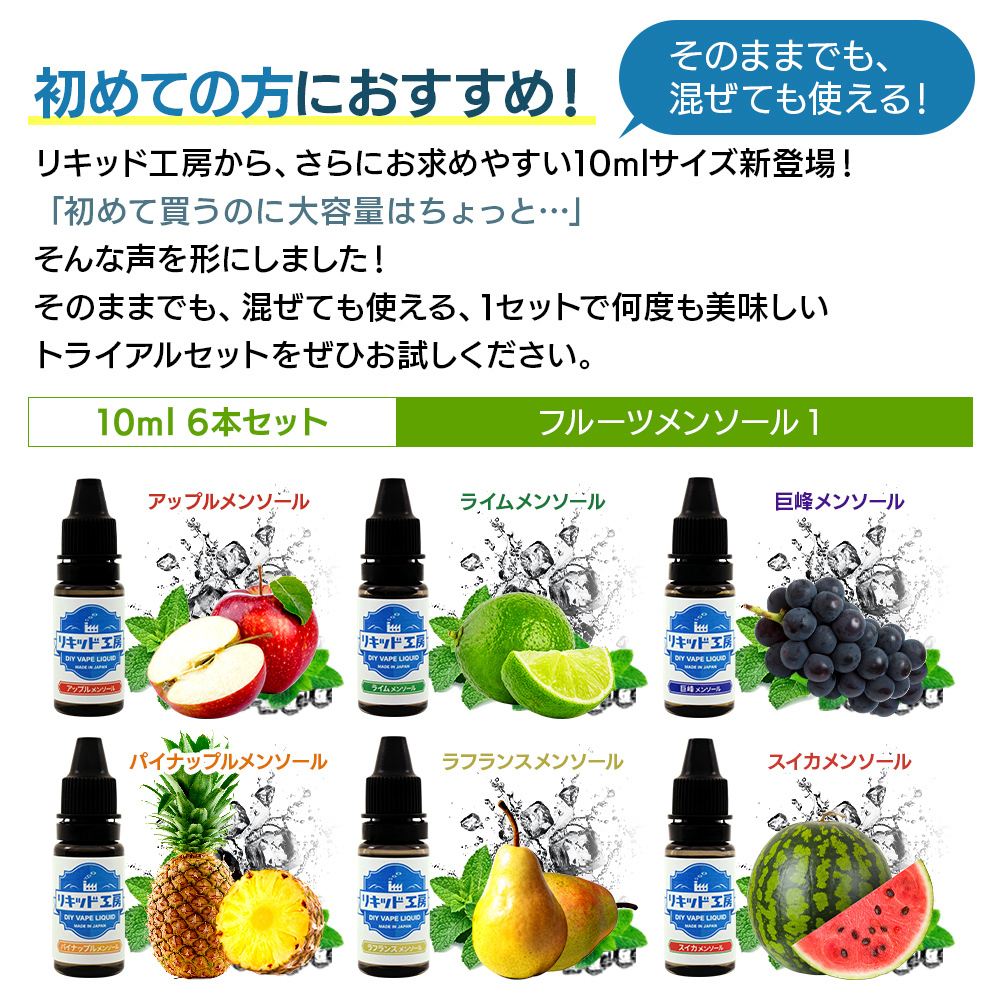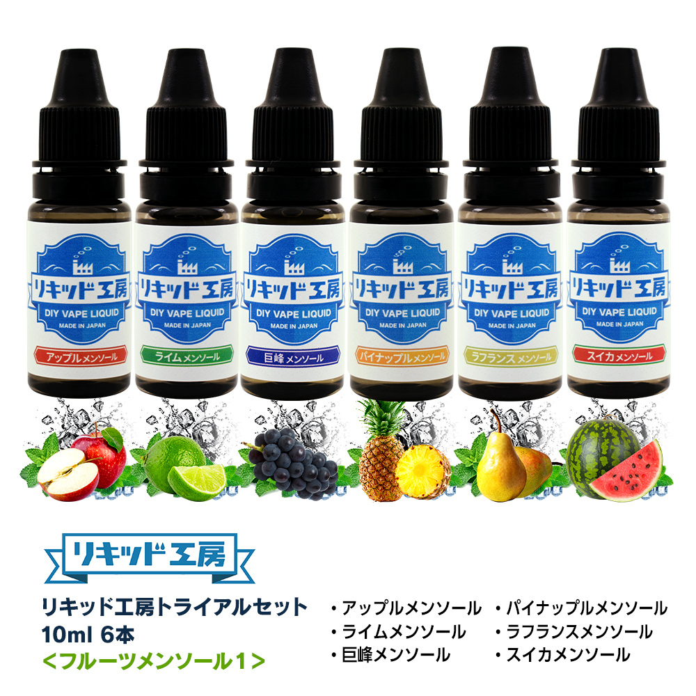 【リキッド工房から10mlシリーズ新登場】みなさまからの【気になるフレーバーを少量サイズのリキッドで試したい】という声から商品化しました。全90種類のフレーバーから人気のフルーツメンソール、アップル、ライム、巨峰、パイナップル、ラフランス、スイカの6種類をお試しセットで販売。そのままでも、混ぜても使える1セットで何度も美味しいトライアルセットです。【安心安全な日本国産】最高品質の天然素材日本ハッカを使用し厚生労働大臣指定の食品添加物のみ100%配合。<セット内容>リキッド工房 人気フレーバー 10ml×6本(アップルメンソール ライムメンソール 巨峰メンソール パイナップルメンソール ラフランスメンソール スイカメンソール)<商品仕様>■ボトルサイズ:10ml■ボトルタイプ:プラスチックボトル■成分:食品用グリセロール純度99.7% 食品用プロピレングリコール99% 食品用香料 天然日本ハッカ■混合比率:VG50%PG50%■香料:ニコチン・タール・有害物質:なし■日本食品分析センター検査済み:発がん性物質検出されず