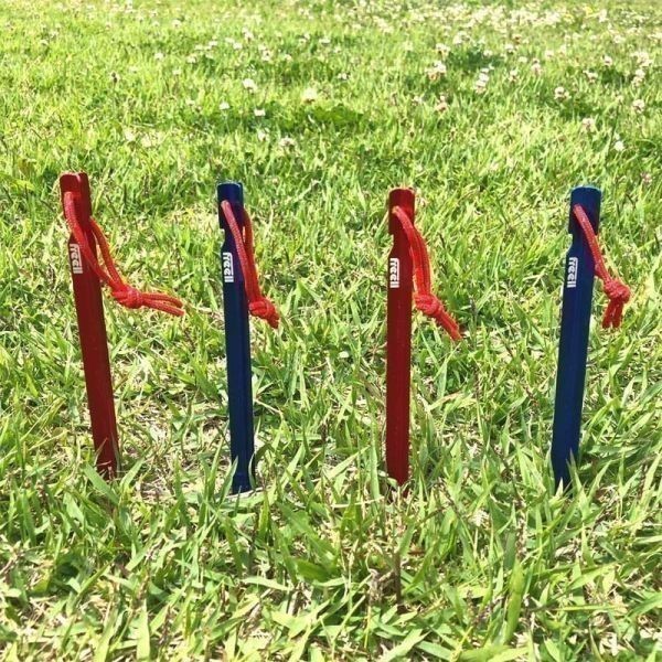 【特殊アルマイト加工 軽量Yペグ】Y 型形状により丈夫で一度刺した地面から抜けにくい構造となっております。レッド5本、ブルー5本、反射材入りペグロープ標準装備。
