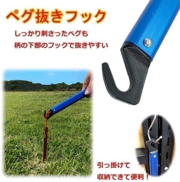 ハンドルは特殊アルマイト加工で強度アップ、色持ちもよく、腐食や磨耗にも強い。ペグ打ち、ペグ抜き、土掘りが1本ででき、大変便利。