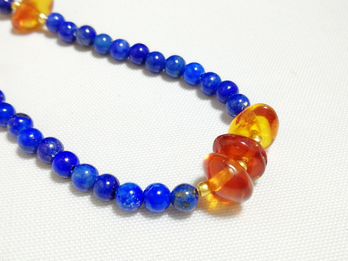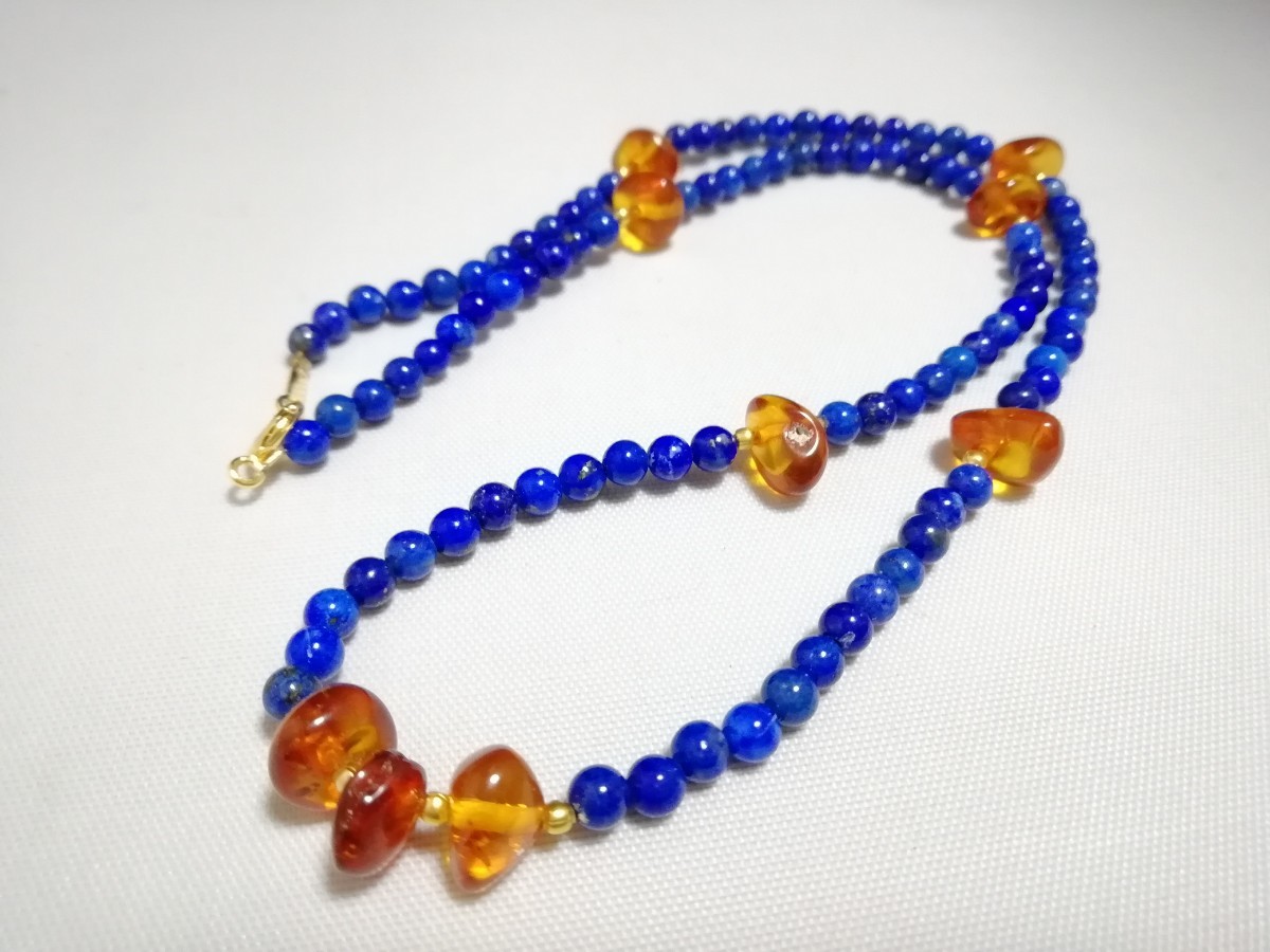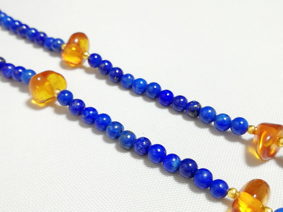 ハイグレード天然ラピスラズリ&天然琥珀オリジナルディザインネックレス