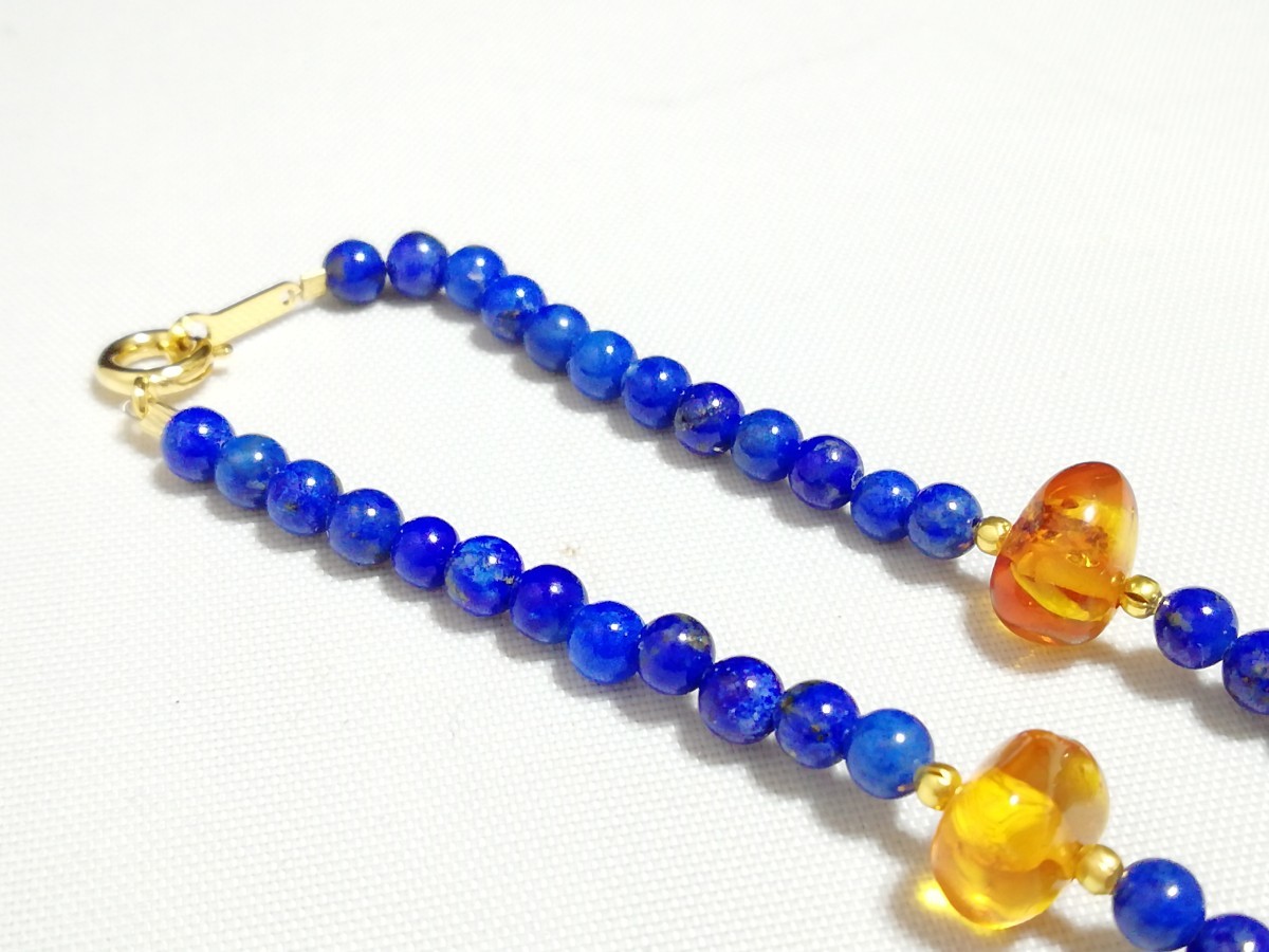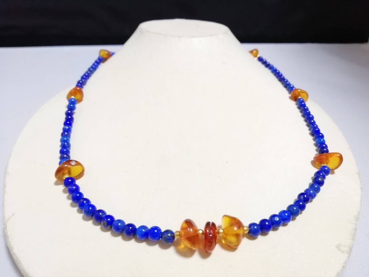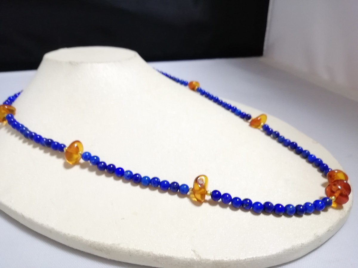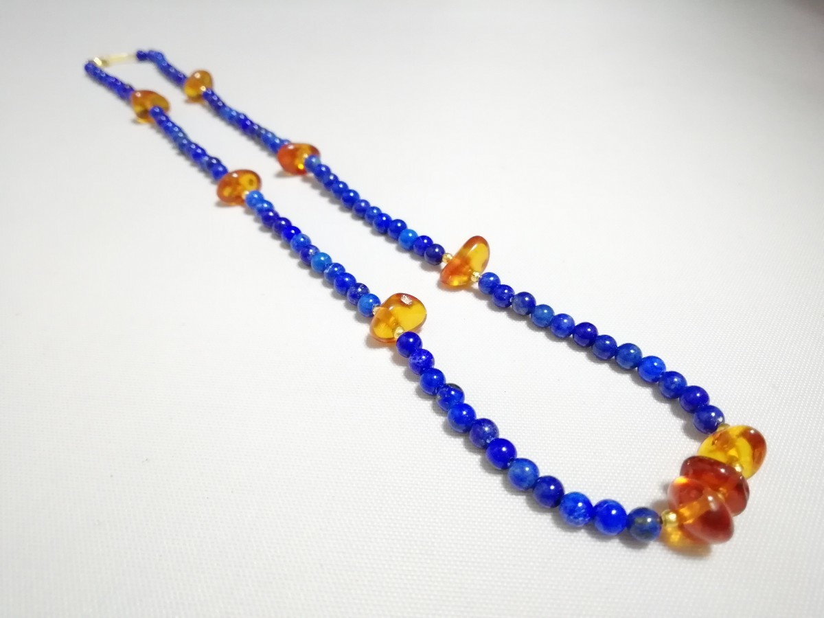 ハイグレード天然ラピスラズリ&天然琥珀オリジナルディザインネックレス