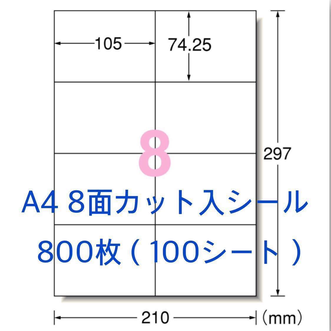 A4サイズ 8面カット入り、ラベルサイズ105mm×74.25mm。はがし易い楽貼加工のシールで宛名シールに最適です。
