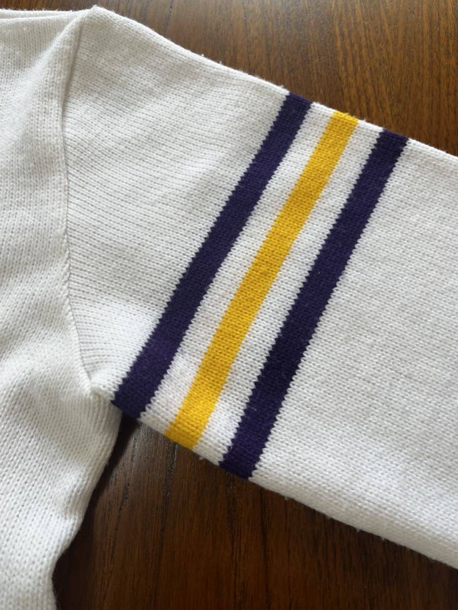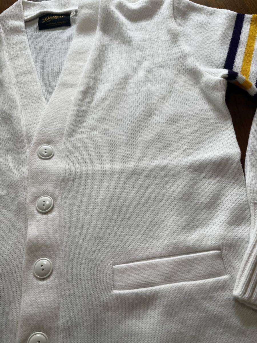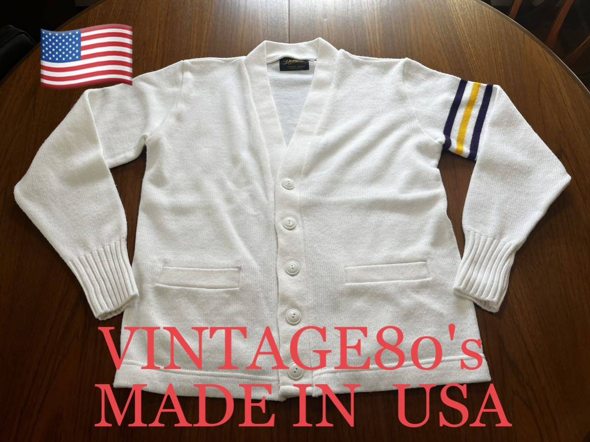 アメリカ製ニットカーディガンになります。多少の毛玉と薄い汚れはありますが、カラーを考えると程度は比較的良いと思います。サイズ40で肩幅45cm身幅55cm着丈62cm袖丈62cmになります。
