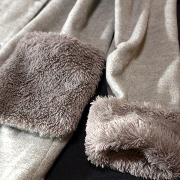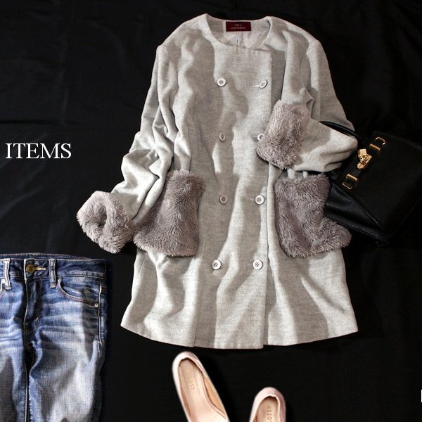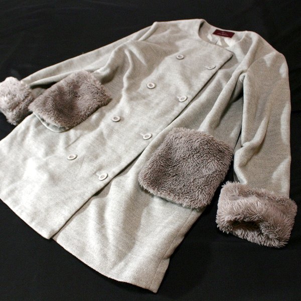 袖とポケットのフェイクファーが取り外しできる、ゆったり可愛いノーカラーコートです。