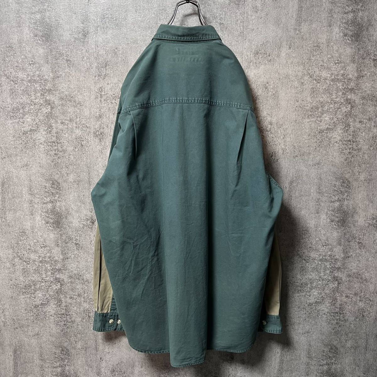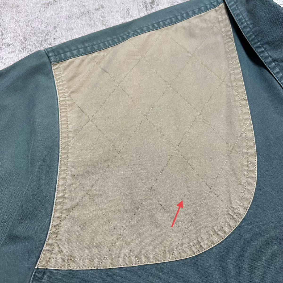 魅力はなんといってもベースのフォレストグリーン系カラーとマッチした、ダークベージュ系のチノ生地のハンティング仕様の切替デザインです!綿100%のやや厚手でハリのあるしっかりしたワーク生地でシルエットも良く、ボタン留め式のロゴタグ入りの胸ポケットやロゴ入りのマーブル模様のボタンもポイントです☆