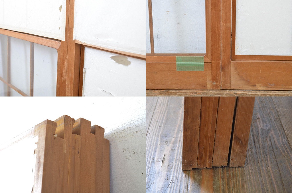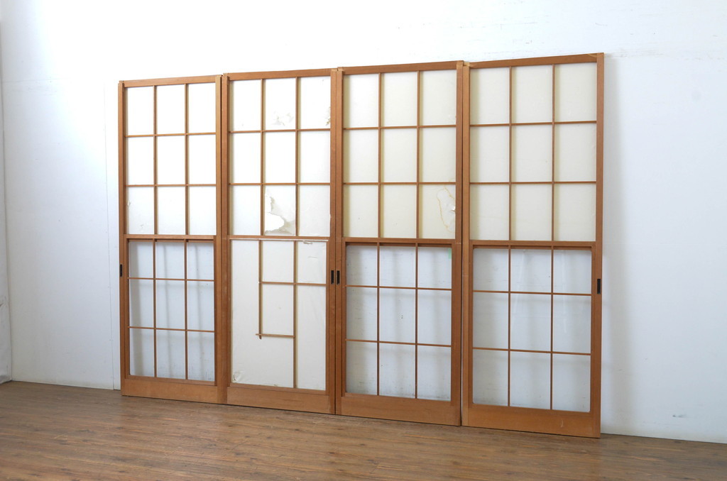 昭和レトロ 使い込まれた風合いが味わい深いレトロな幅狭雪見障子戸4枚セット(建具、引き戸)(R-063590)