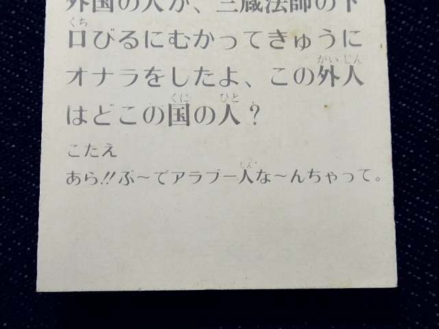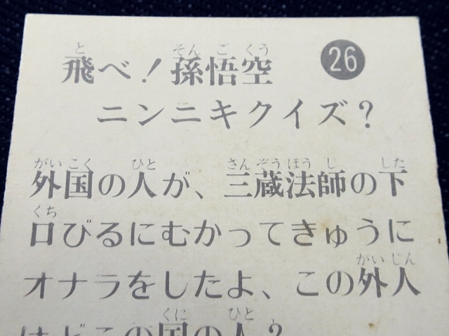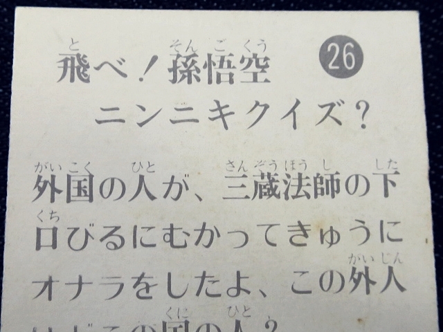 飛べ!孫悟空 ミニカード バラ売り 1枚 ・天田製 ・約 6.5 cm x 5.0 cm (裁断により若干誤差有り) ・1978年頃に駄菓子屋などにて発売された商品です。 ・同番異種カード有り。一つの番号に表絵柄が2~3種類のカードが多数確認されています。 ・表絵柄は推定40種 40種確認 ・アルバムは、キャラ型変則型キーホルダータイプ、(およげたいやきくんもキャラ型変形タイプの一種) ・番号は、推定1-36。 ・未確認番号 23.37.38.39.40 ・中古扱い ・同梱発送可能です。(複数落札の場合、定形.定形外郵便の送料が変わる場合がございます。) ※規則性 3種3種3種3種3種2種1種1種1種 の順で同番異種の可能性有り ・01-3種確認 ・02-3種確認 ・03-3種確認 ・04-3種確認 ・05-3種確認 ・06-2種確認 ・07-1種確認 ・08-1種確認 ・09-1種確認 ・10-3種確認 ・11-3種確認 ・12-3種確認 ・13-3種確認 ・14-3種確認 ・15-2種確認 ・16-1種確認 ・17-1種確認 ・18-1種確認 ・19-3種確認 ・20-3種確認 ・21-1種確認 ・22-3種確認 ・23-カード未確認 ・24-2種確認 ・25-1種確認 ・26-1種確認 ・27-1種確認 ・28-3種確認 ・29-3種確認 ・30-3種確認 ・31-3種確認 ・32-3種確認 ・33-2種確認 ・34-1種確認 ・35-1種確認 ・36-1種確認 ・37-カード未確認 ・38-カード未確認 ・39-カード未確認 ・40-カード未確認 〓参考項目〓 ・ 放送期間:1977年10月〜1979年3月 全74回 ・ 主題歌:「スーパーモンキー孫悟空」ピンク・レディー ・ 挿入歌:「ゴー・ウエスト」 ・ 製作著作:TBS ・ 出演:ザ・ドリフターズ(いかりや長介、仲本工事、加藤茶、志村けん、高木ブー)、ピンク・レディー、 すわ親治、キャンディーズジュニア、あのねのね、小島一慶 | ||