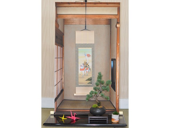 飾り台(平型)にミニ床の間タペストリーとミニ掛け軸武者を掛け、盆栽を置いたイメージです。