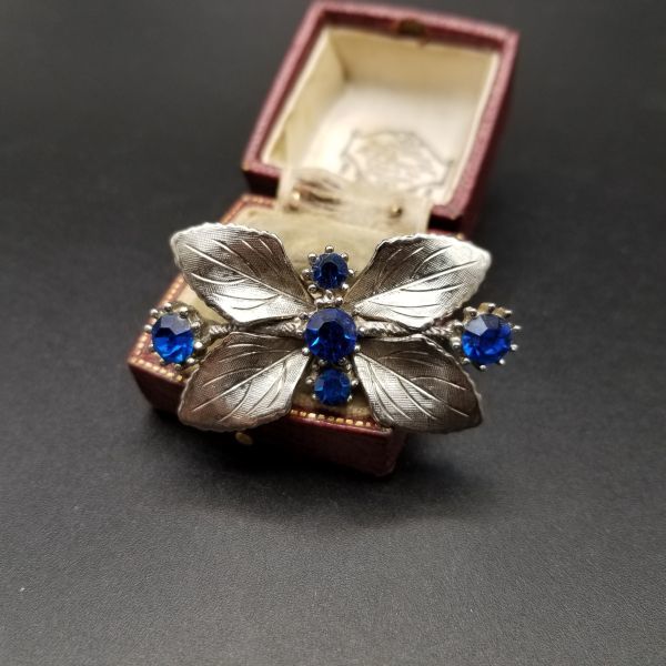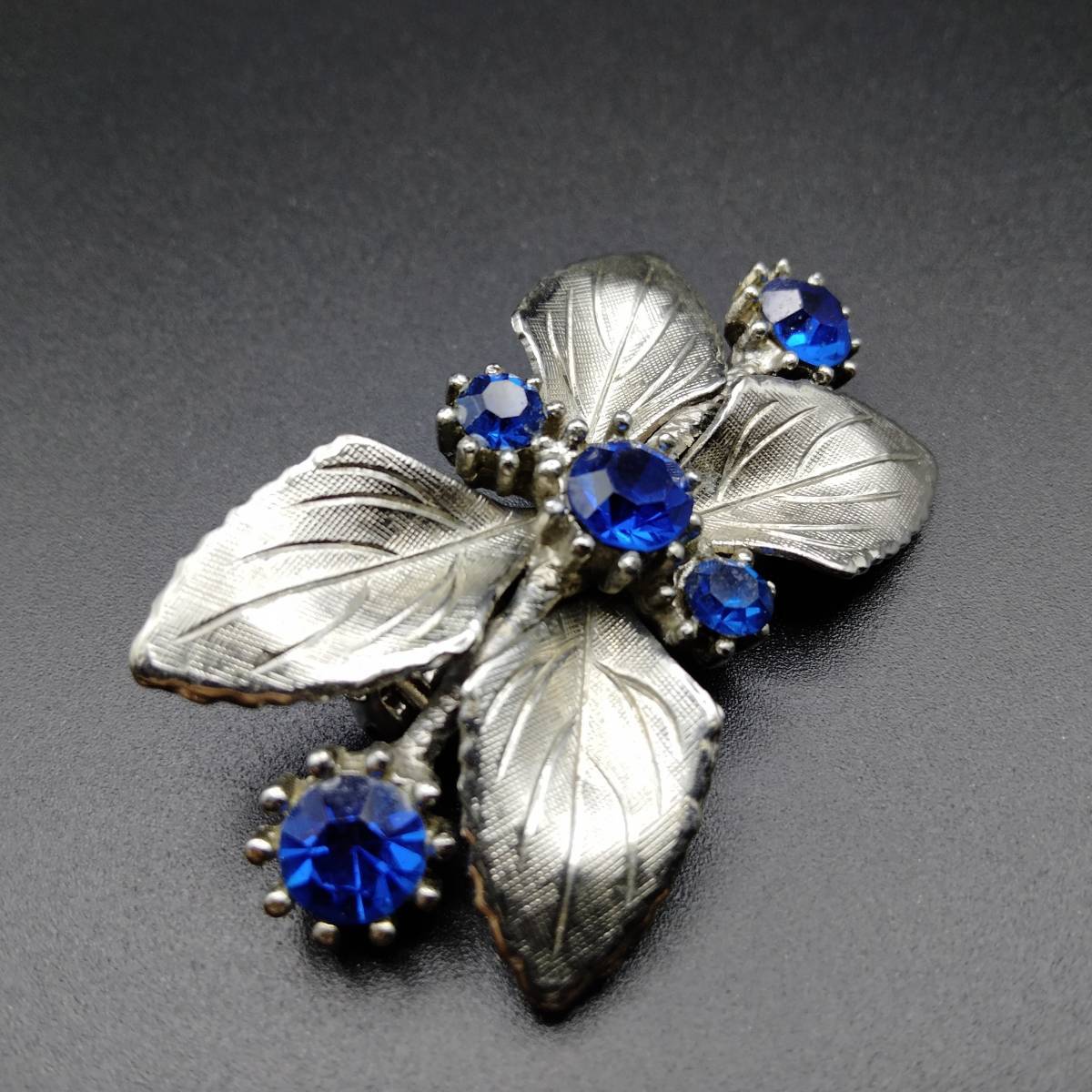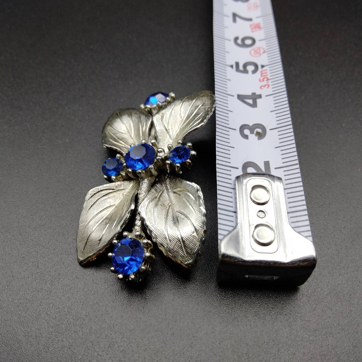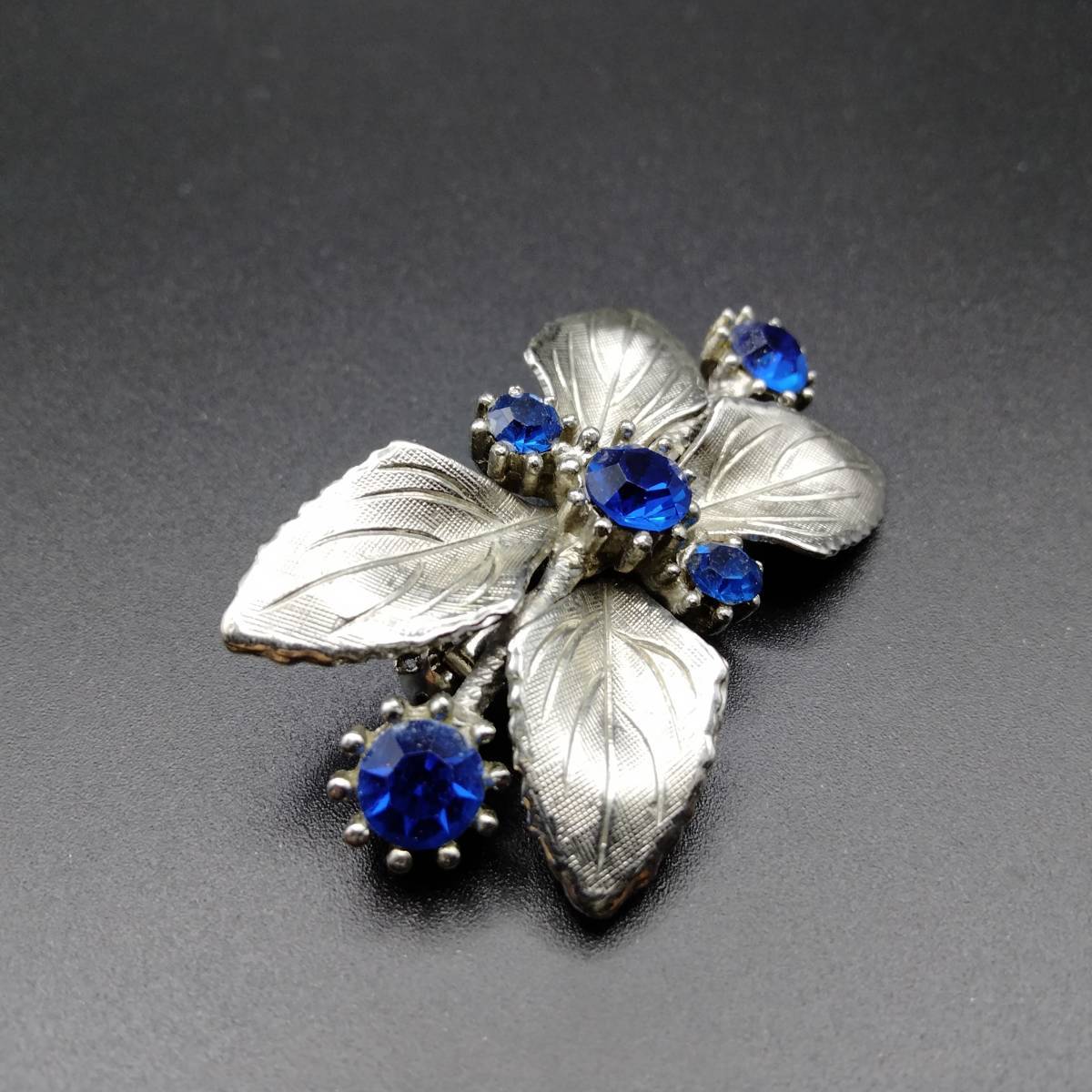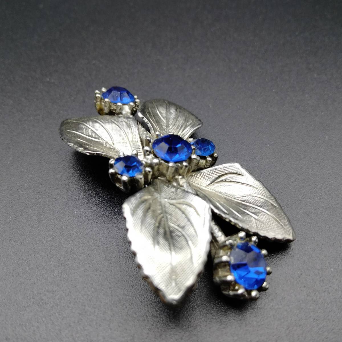 リーフ 植物 モチーフ サファイヤブルー ラウンド ストーン シルバートーン クラシック ヴィンテージ ブローチ ジュエリー 輸入 Y9-B