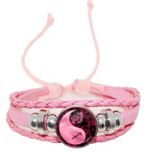 【いて座、ピンク】12 星座ブレスレット陰陽星座ガラスカボションピンクレザーブレスレット女性女の子誕生日ギフト