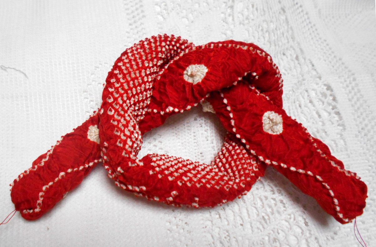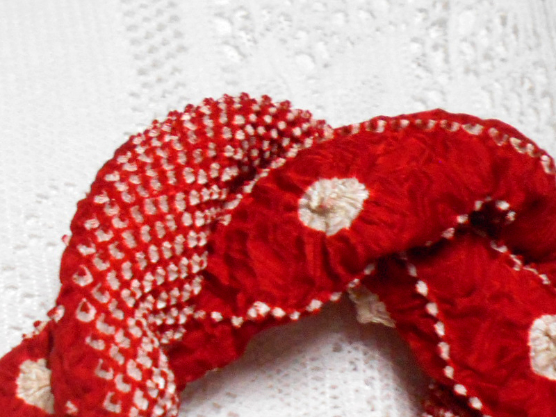 実際のお色は落ち着いた少しダークな赤に絞り模様が染められていて少しレトロな感じのお品です。