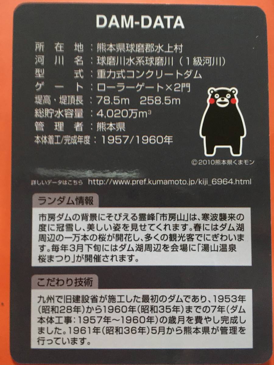 ★☆★ダムカード 熊本県水上村 市房ダム1枚です。