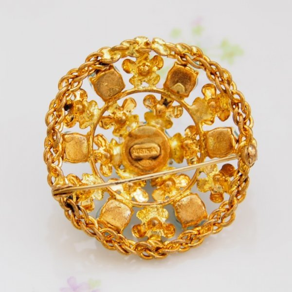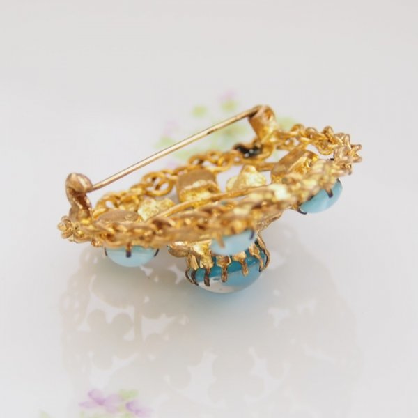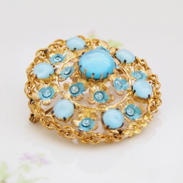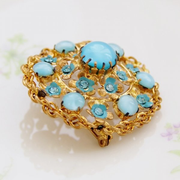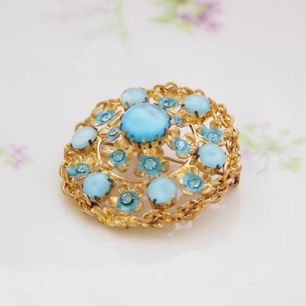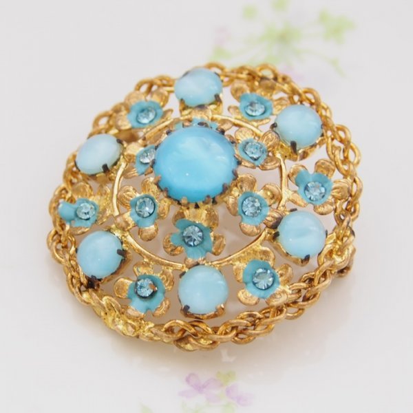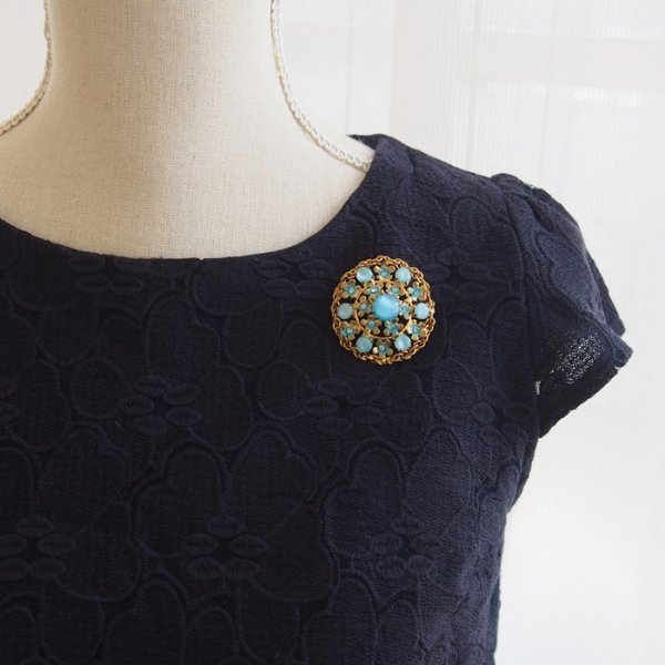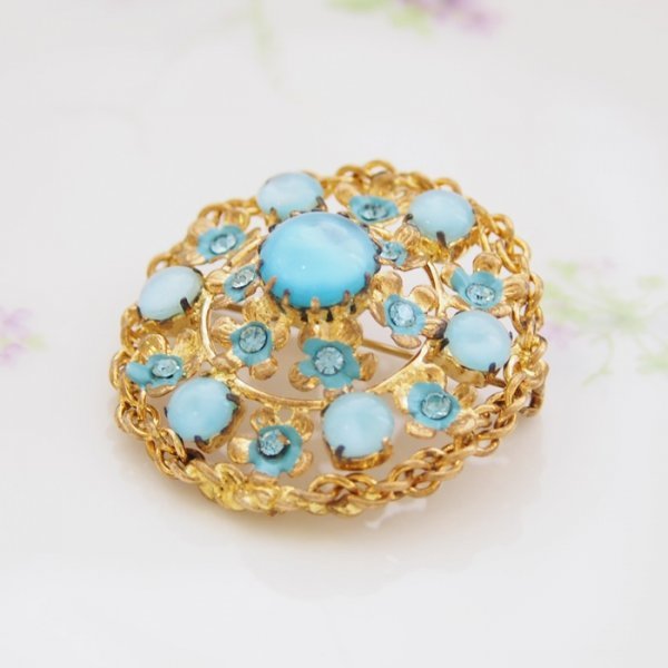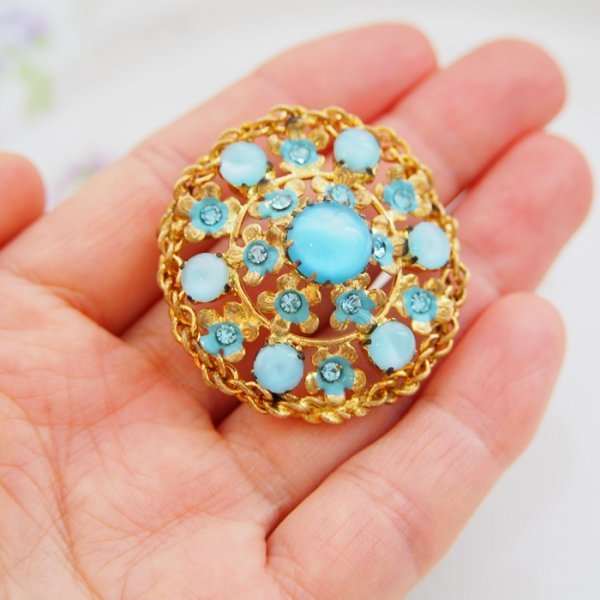 優しいいミルキーブルーガラスストーンが美しいブローチです。 小さなブルーのお花がとても可愛らしい雰囲気です。 お洋服以外にも帽子や鞄のアクセントにもどうぞ。 経年の為、金属部分に小キズ、スレや黒ずみが見られます。 ピンのキャッチの部分はカバーがありません。 念の為、シリコンのブローチ留めを同封させて頂きます。 表面に所々コーティングの剝がれがあり、黒ずみが見られます。 ■ブランド: AUSTRIA ■刻印: AUSTRIA ■サイズ: 約4.3cm x 約4.3cm ■重量: 約12g アンティーク・ヴィンテージ商品には、経年による傷や劣化などがあります。 目立つものはアイテムの詳細に記載しておりますが、説明以外にもキズや損傷などがある場合がございます。 古いものですので、ご理解いただける方のみご入札下さいませ。 他サイトでも販売しておりますので、同時にご注文があった場合は、品切れの場合もあります。その場合は、大変申し訳ございませんが、ご注文をキャンセルとさせて頂きます事をご了承くださいます様お願いいたします。 | |||