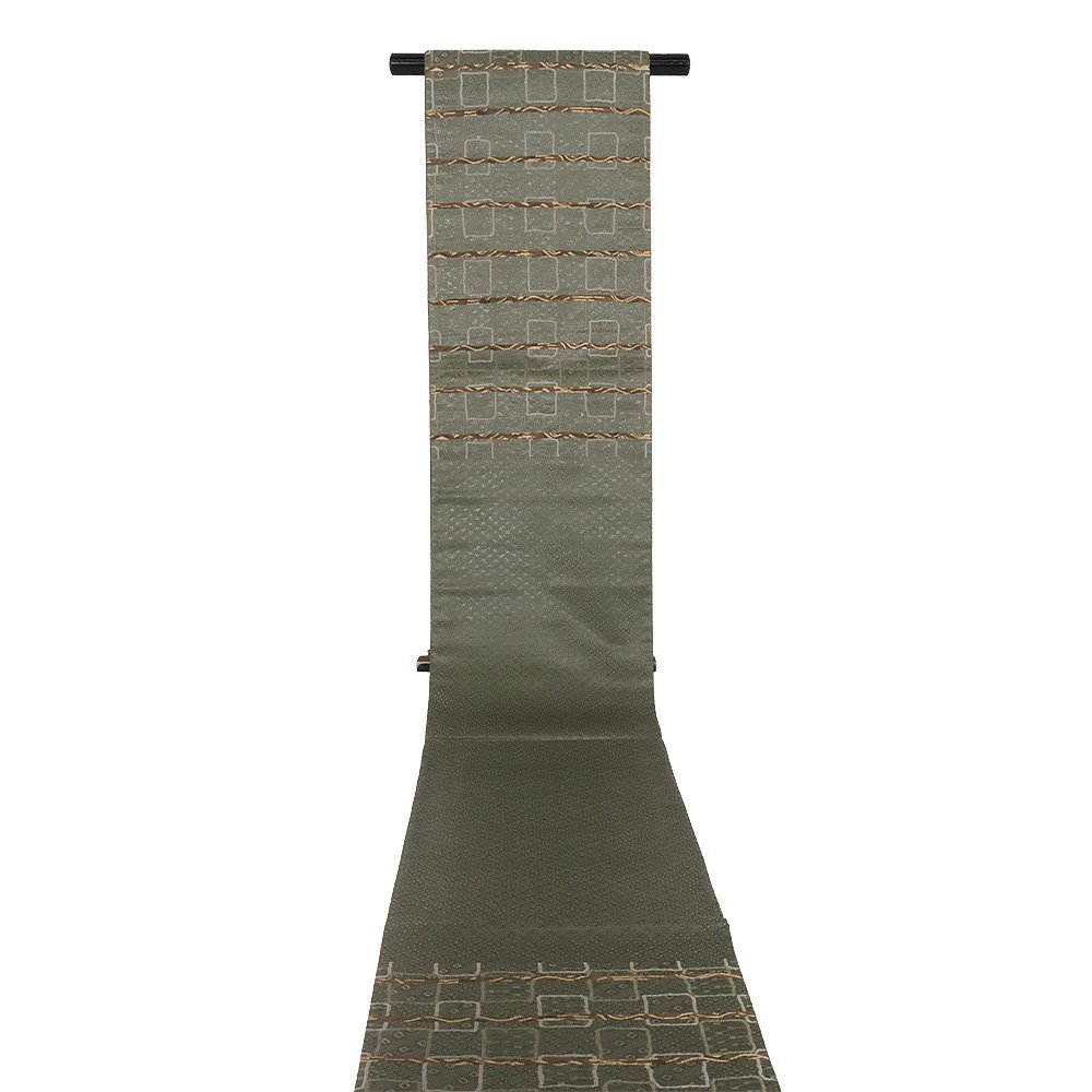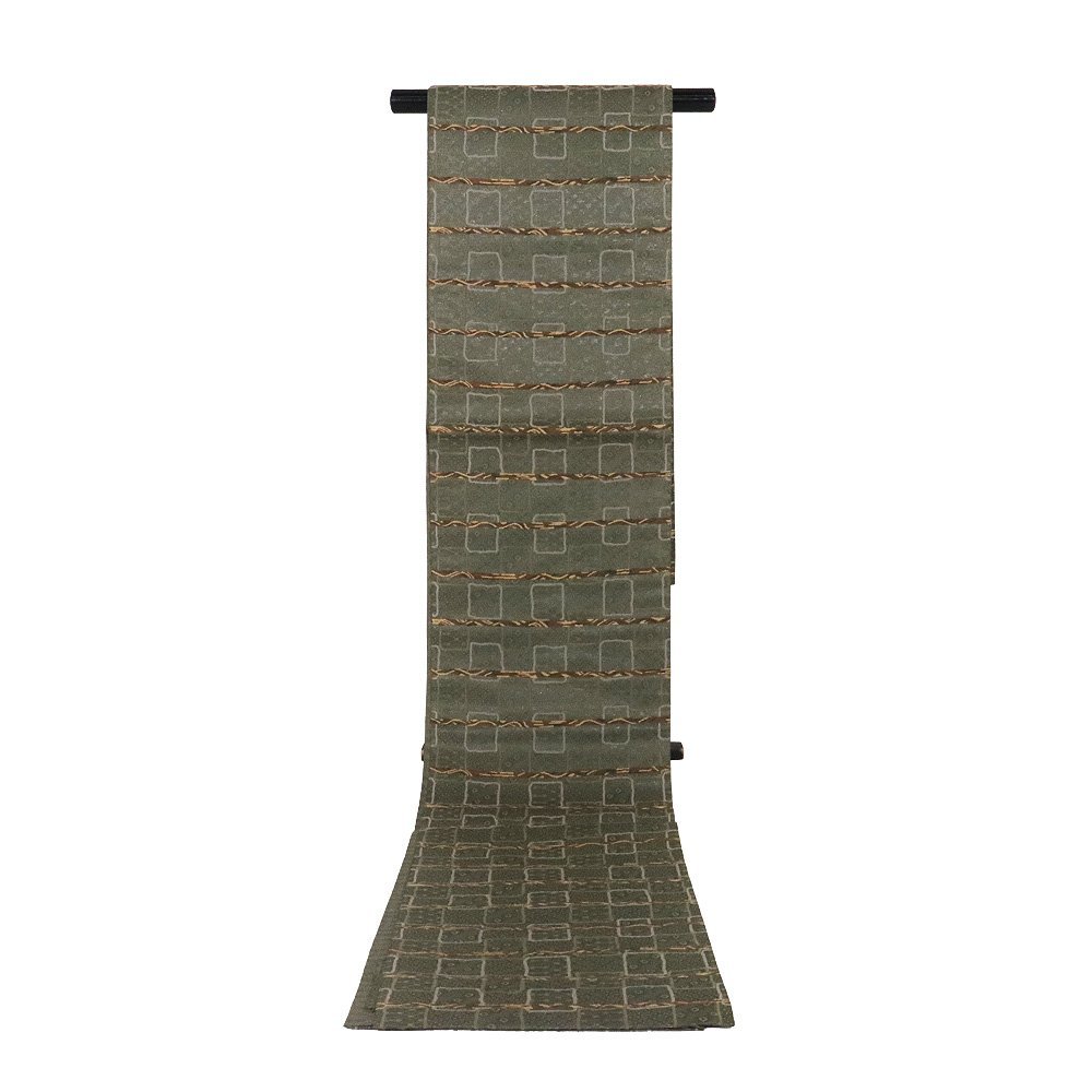 西陣織袋帯 緑地 格子縞・鹿の子・四つ目菱・菱文 (写真では上手く色が出ない場合があります。ご了承下さい) ※お使いのディスプレイの種類や設定の差により 実物の色と画像の色が少々異なることもございます。 写真の枚数が多いので一度パソコンでご覧ください。 |