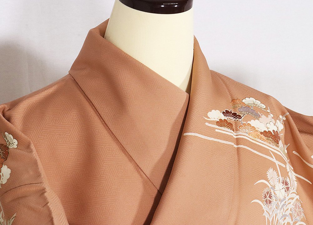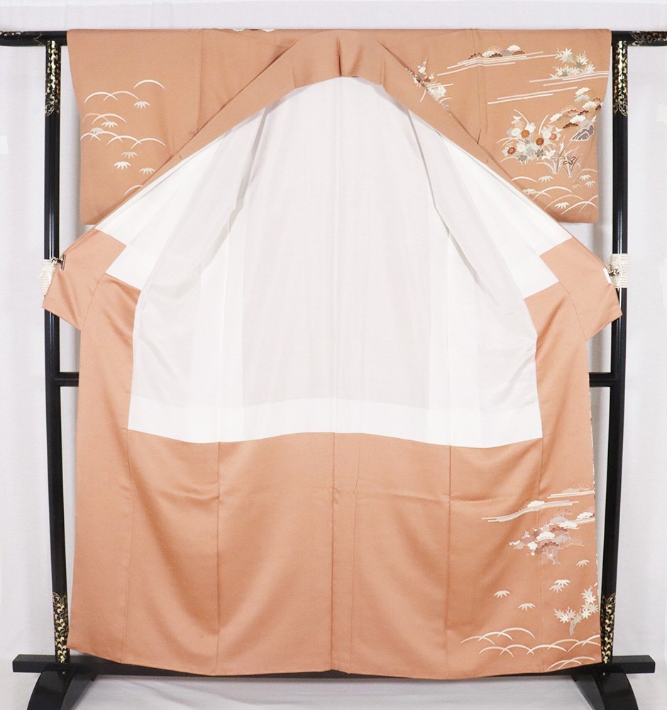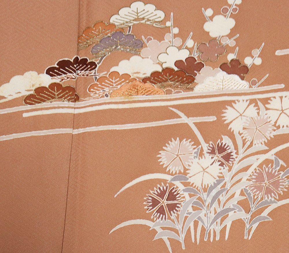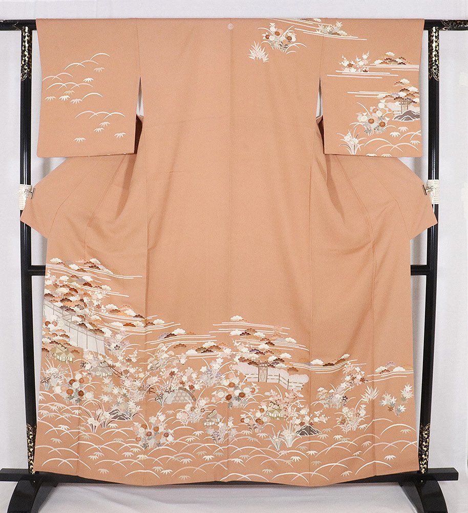| 友禅訪問着 袷 濱縮緬地 レンガ色地 茶屋辻・松竹梅・菊・菖蒲・桔梗・紅葉・芝草 金駒刺入り 166 広襟 一つ紋 |