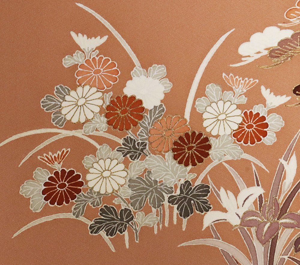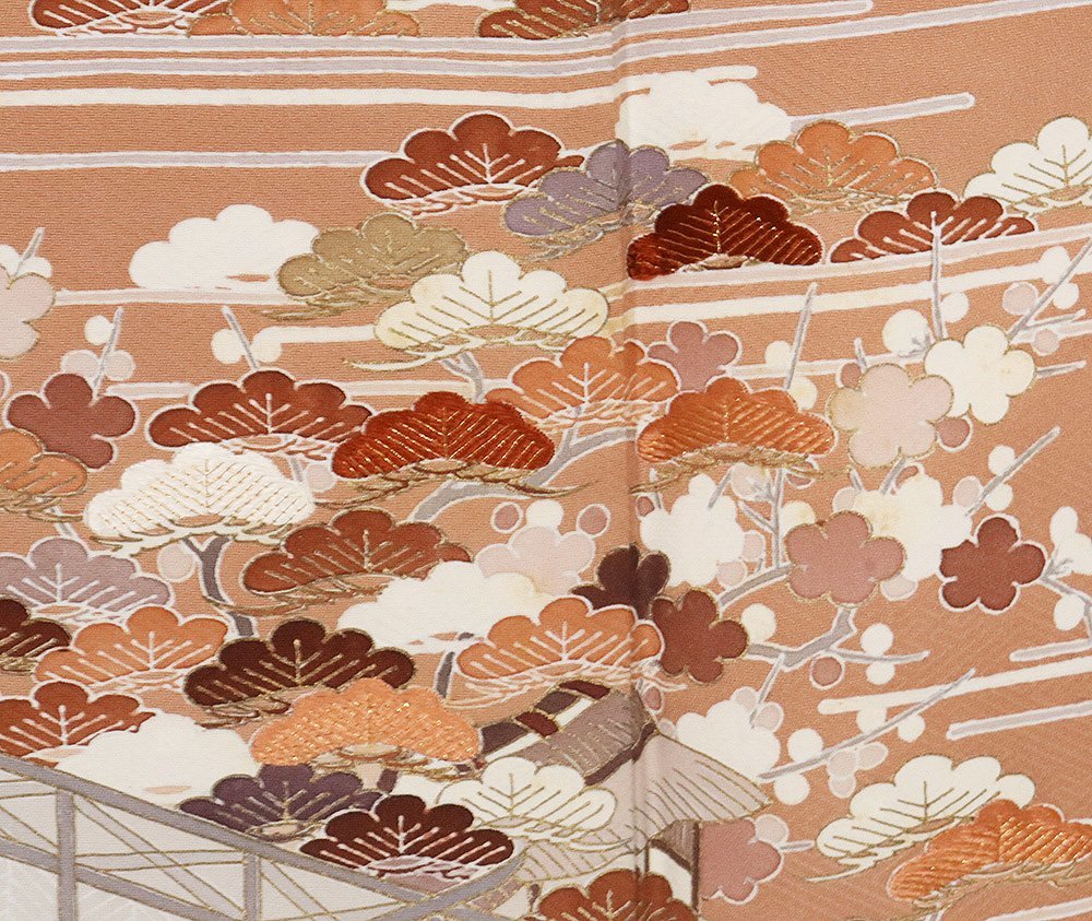 友禅訪問着 袷 濱縮緬地 レンガ色地 茶屋辻・松竹梅・菊・菖蒲・桔梗・紅葉・芝草 金駒刺入り (写真では上手く色が出ない場合があります。ご了承下さい) |